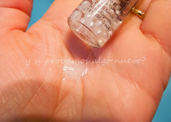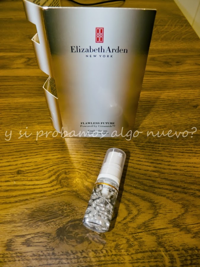 La primera que he probado ha sido el sérum Flawless future de Elisabeth Arden. Es una minitalla de 5ml. no es gran cantidad pero para hacerse una idea es suficiente. Es un bote con un montón de perlitas dentro, pero cuando lo echas en la mano es un líquido de color nacarado. Para ser un sérum no me ha parecido que se absorba demasiado rápido.