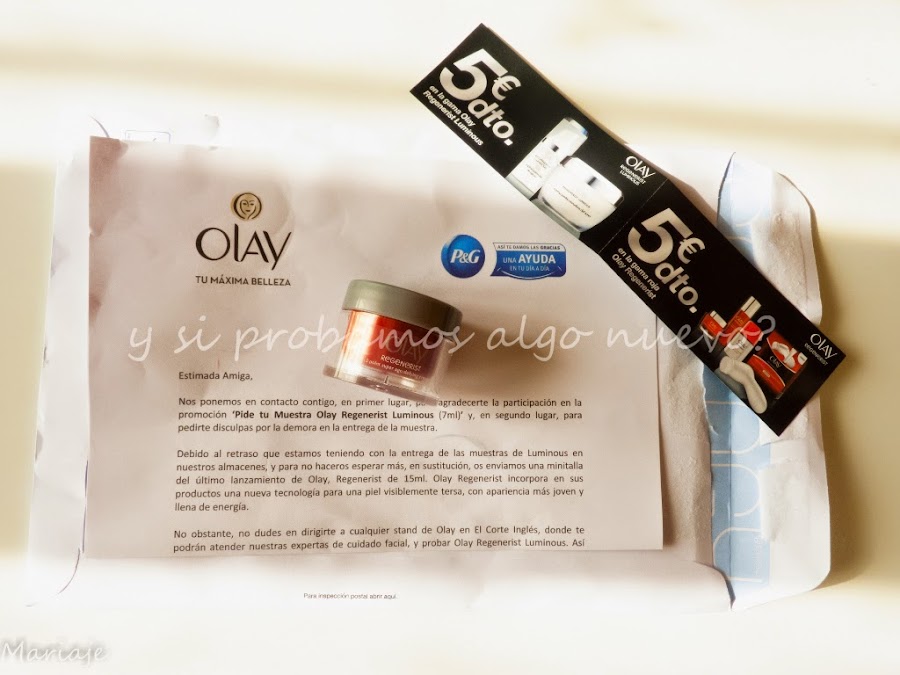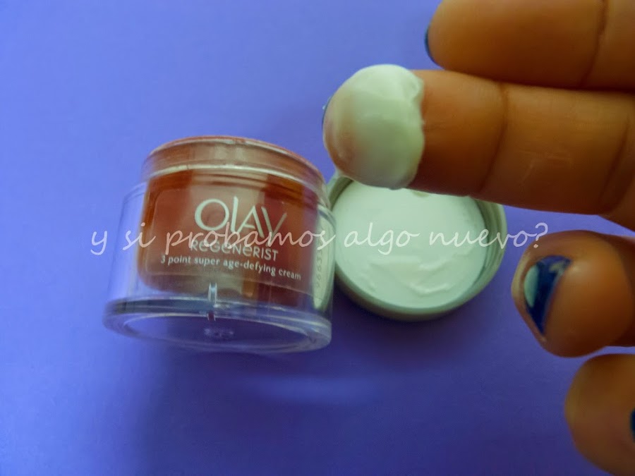 La siguiente muestra que he probado ha sido la de Olay Regenerist, se suponía que iban a mandar la Luminous, pero tuvieron algún problema y mandaron esta minitalla de 14ml. además de dos vales de 5â?¬ cada uno para ambas cremas que valen para cualquier crema de la gama. Se trata de la crema Tres Áreas de Cuidado Intensivo, promete piel más joven en el contorno de ojos, óvalo facial y cuello.