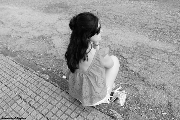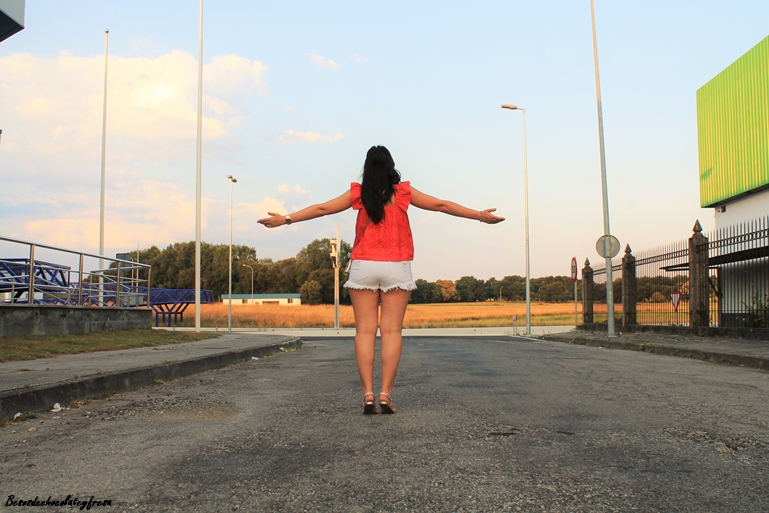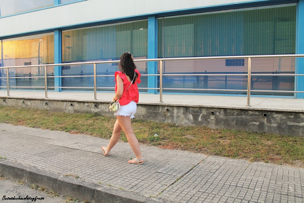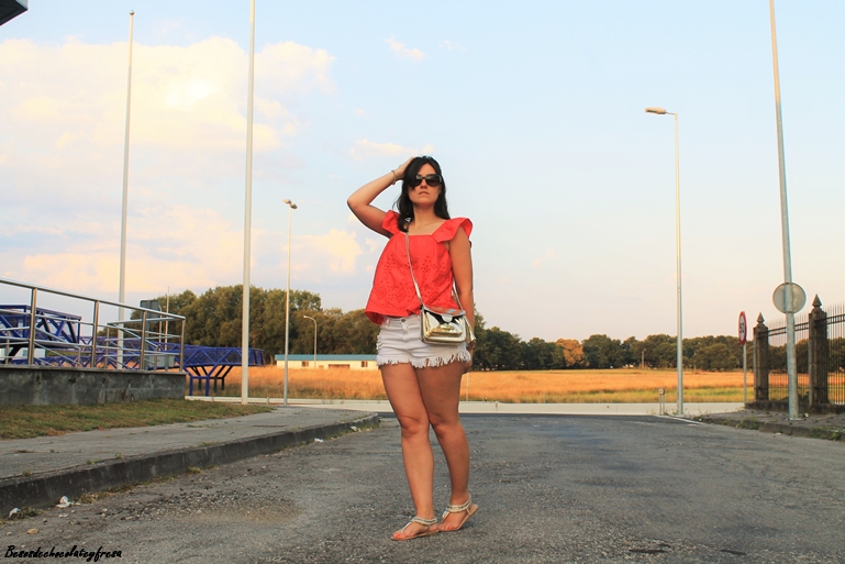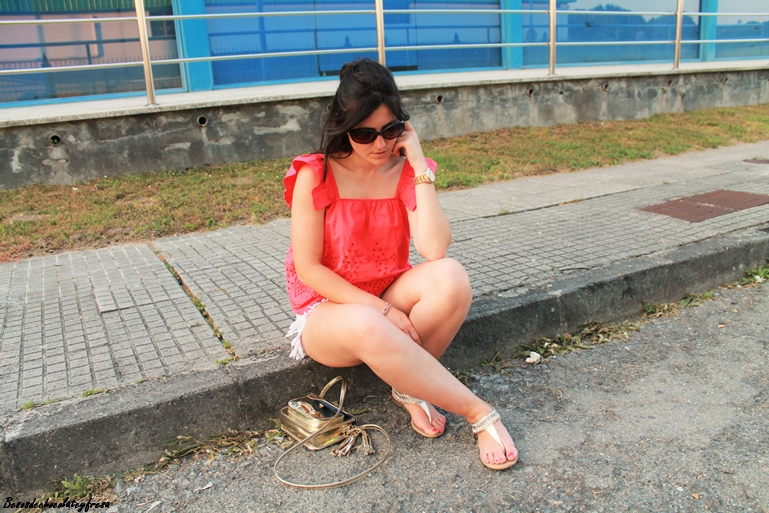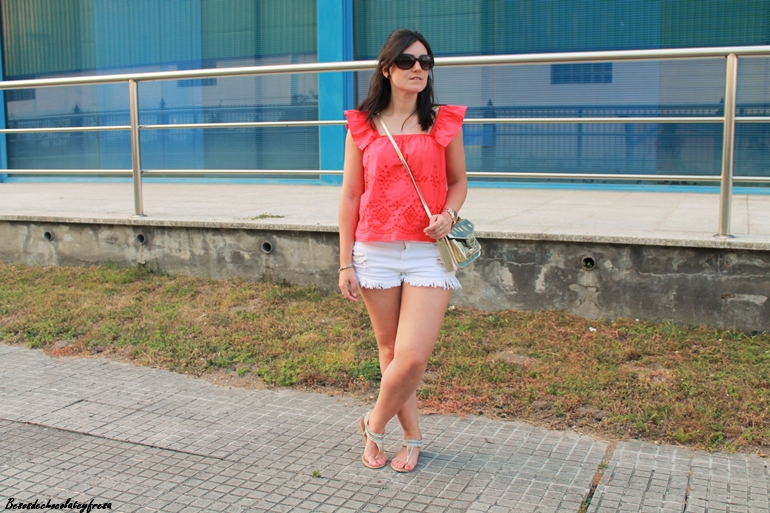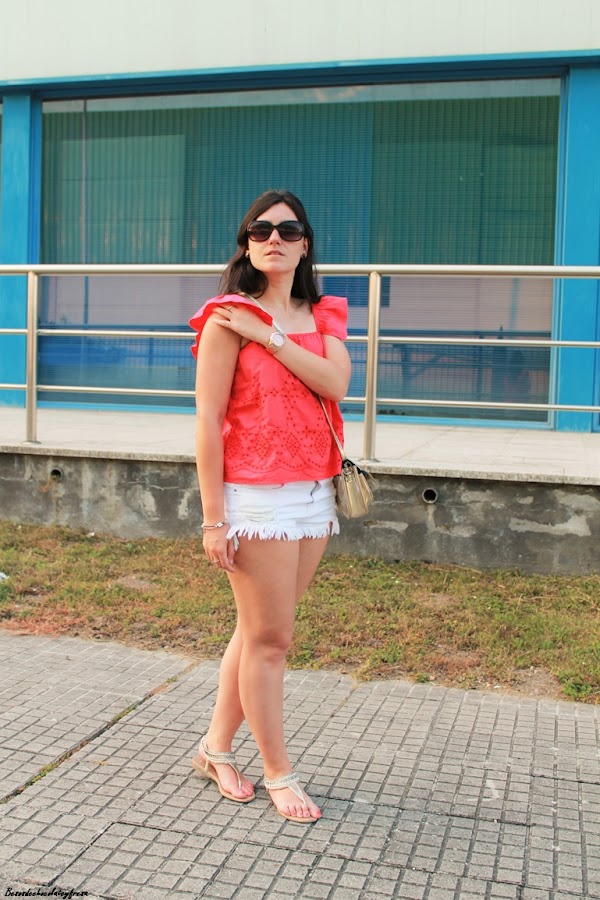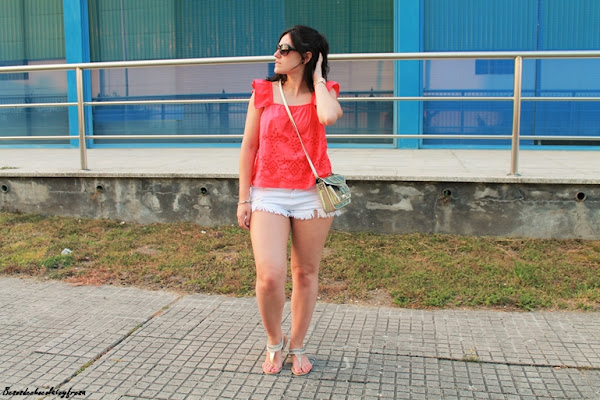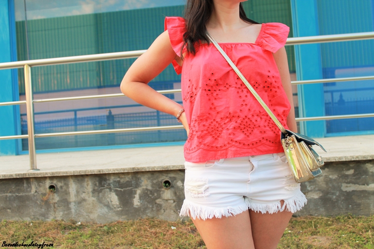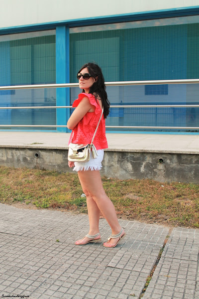 Para esta ocasión la combiné con shorts en blanco y sandalias joya, uno de mis imprescindibles de verano sobre todo estos días que tuvimos la ola de calor encima y bolso en dorado.