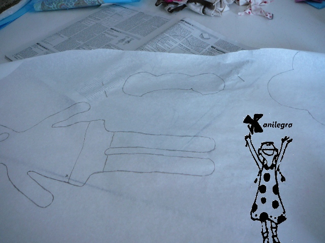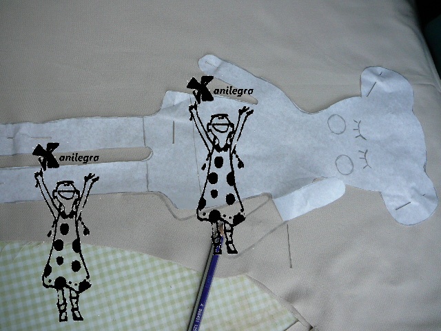 Poneis la tela con la que vais a hacer la muñeca doble , y sujetais el patrón con alfileres .