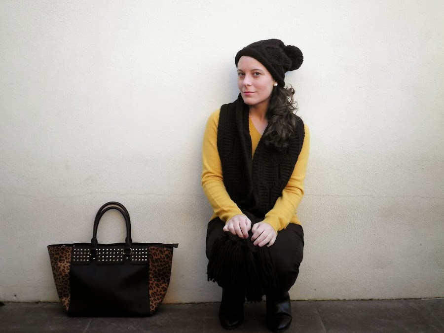 Hoy os propongo un outfit muy cómodo y casual. Unos pantalones negros, un jersey de punto de color mostaza y complementos con toques de animal print. Me gusta mucho combinar el color mostaza con el negro porque así el jersey tiene todo el protagonismo. Es un color vivo, lleno de luz y que a las morenas nos favorece. Así pues, para este miércoles tan ajetreado que a mi me espera os dejo con este look todoterreno. Y si hace frío, como es el caso de estos días, un gorrito y una bufanda de lana.
