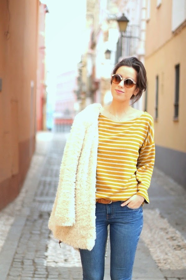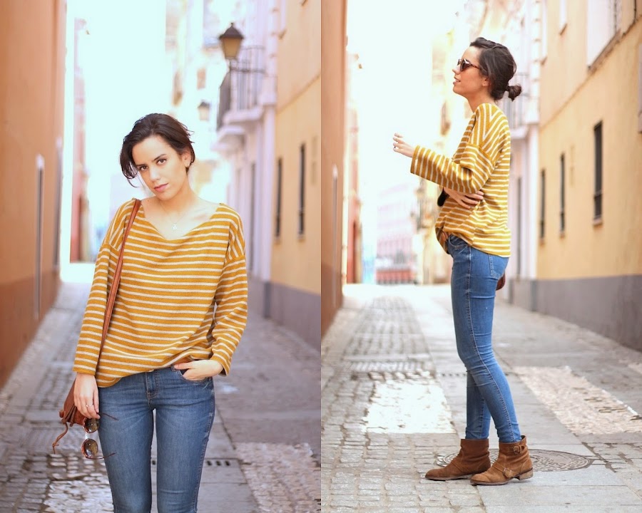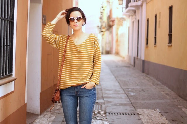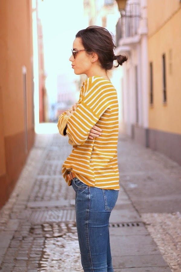 Bueno, creo que ya definitivamente decimos adiós a los abrigos peluche o gorditos no? al menos yo si le digo bye bye! Un bonito jersey de punto en tono mostaza con rayitas me gustó lo suficiente para tomar unas cañitas por mi Casco Antiguo de Badajoz. Acompañada por gafotis Dorado Vintage, jeans y cómodas botas.