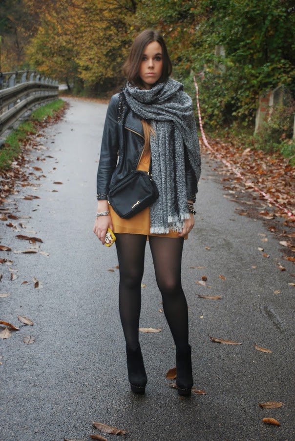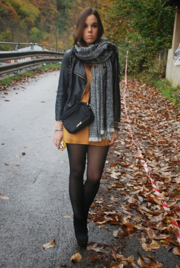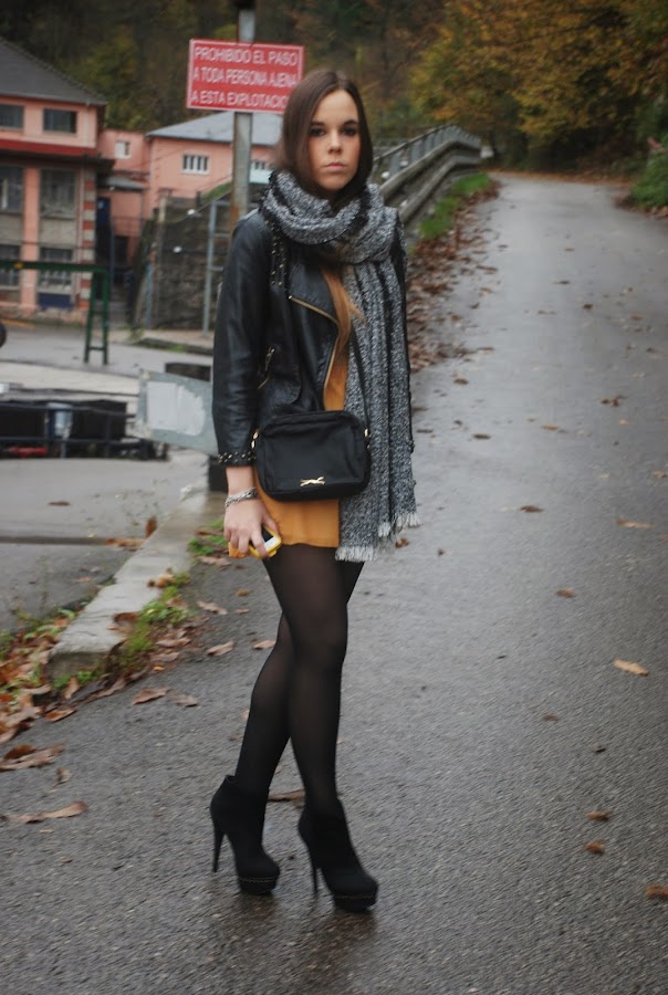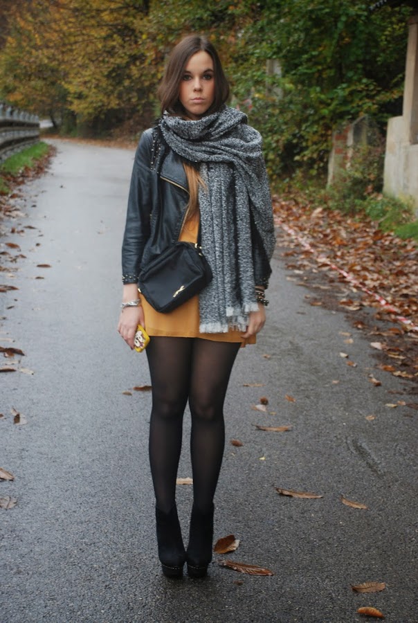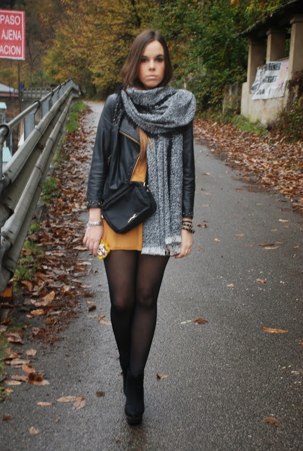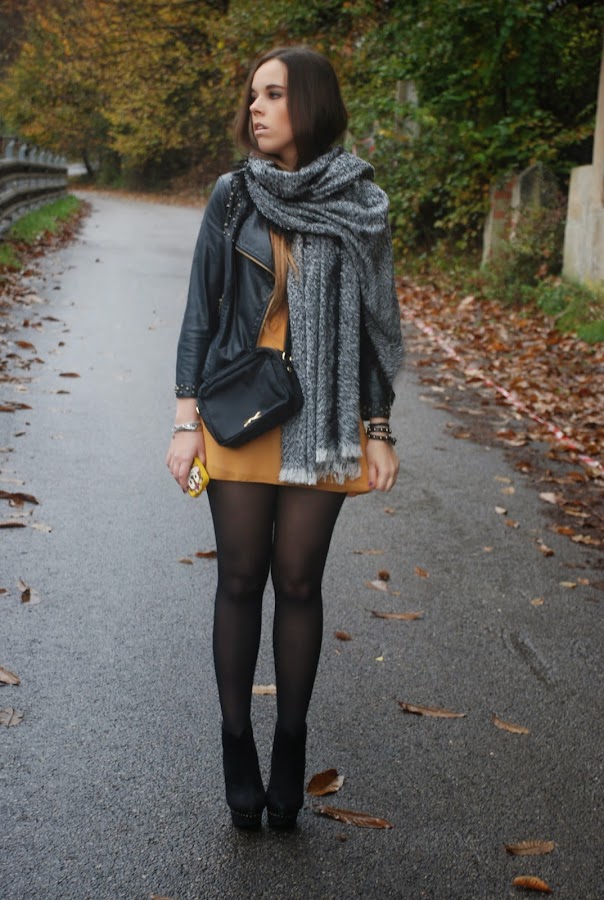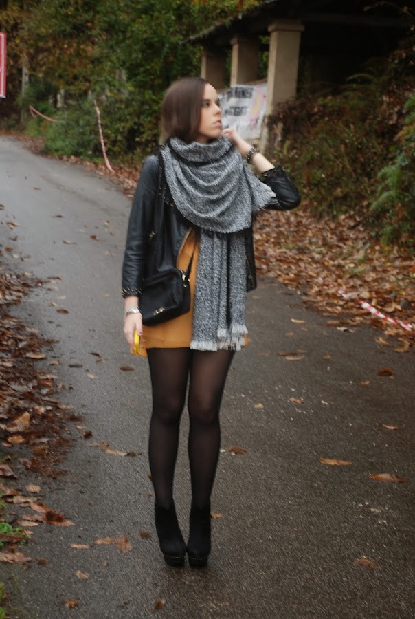 Como ayer no hacía mucho frío lo combiné con mi chaqueta negra de polipiel, medias tupidas, botines, bolso negro y maxi bufanda.