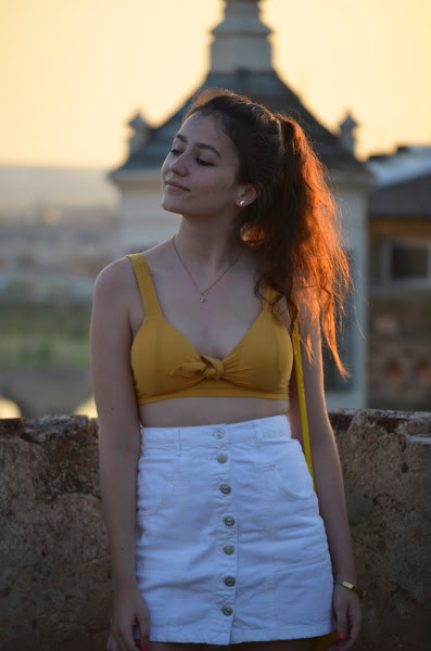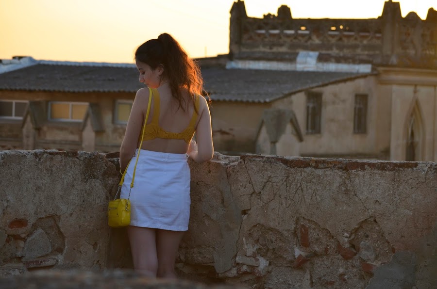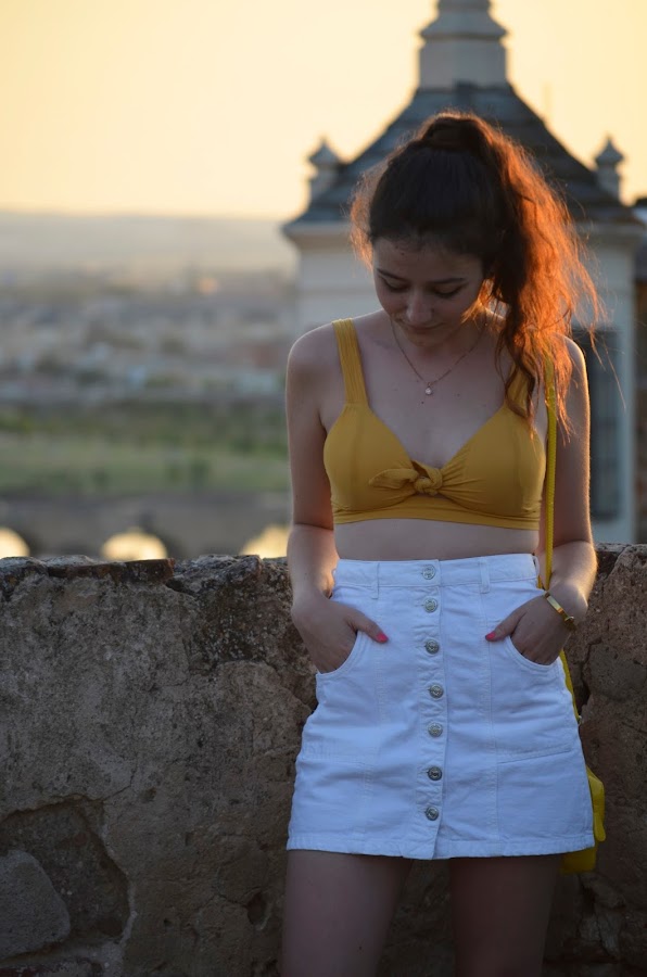 Hoy os muestro un look que fotografiamos al llegar de nuevo a casa después de las vacaciones. Hacía muchísimo calor así que opté por falda vaquera en color blanco, top color mostaza de SheIn, combinado con sandalias en el mismo tono. No podía faltar mi nuevo bolso amarillo de Lefties. ¿Qué os parece?