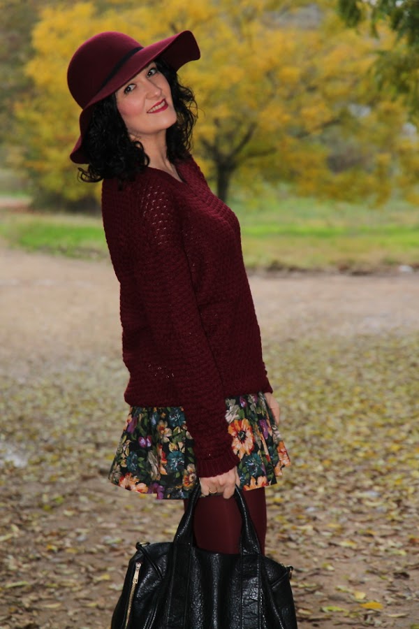 Vuelta al lunes, no se a vosotros pero a mi los fines de semana se me pasan volando. Pero bueno es lo que toca así que no me lío más y os dejo con el look de hoy. Llevo un outfit en el que el claro protagonista es el color del año, el Marsala. He combinado un jersey de punto que me resulta ideal para no pasar frío, ya sabéis que soy muy friolera, y falda de flores para romper el total look granate. El resto del look compuesto por botines granates híper cómodos, sombrero fedora y uno de mis bolsos favoritos.