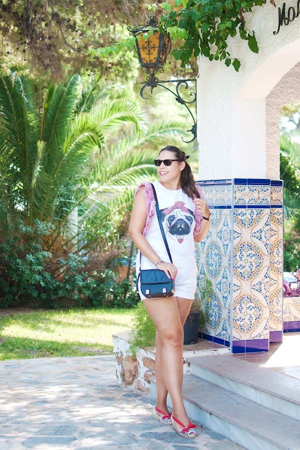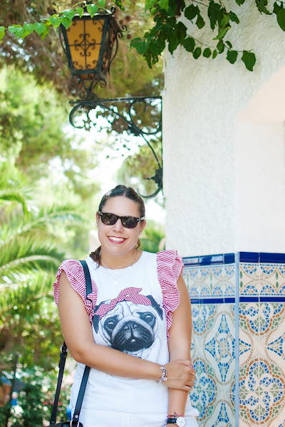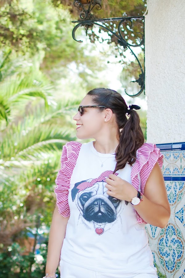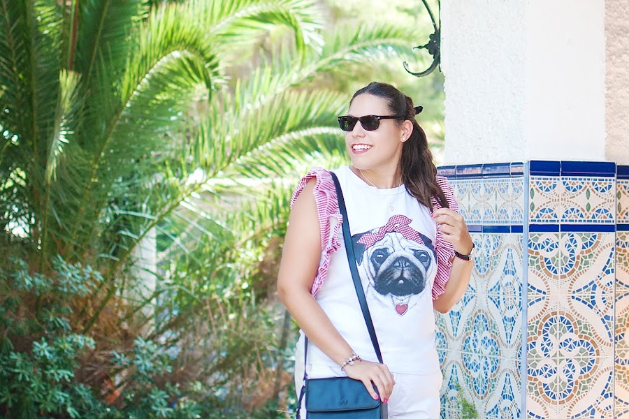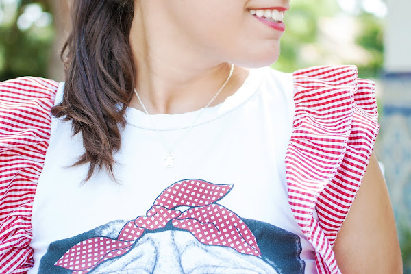 Por lo menos por aquí por Asturias, el verano no quiere irse de nuestro lado y yo soy más feliz que unas castañuelas. Los looks veraniegos siguen formando parte de mi día a día y espero que por mucho tiempo más porque en el norte el invierno se hace demasiado largo. La protagonista del outfit de hoy es esta dulce camiseta, un flechazo en toda regla que hasta que no me hice con ella... ¡No paré! La adoro por su bonito dibujo, por sus volantes, por sus cuadritos vichy... Es perfecta para llevarla tanto por fuera como por dentro del pantalón y la verdad es que se ha convertido en mi camiseta más top de esta estación. Creo que representa totalmente mi personalidad y mi forma de ser, y es una de las cosas que más me gustan de la moda: poder adaptarla absolutamente a ti. La combiné con mis shorts en blanco y mis inseparables alpargatas de Lucía Be que nunca me cansaré de poner.