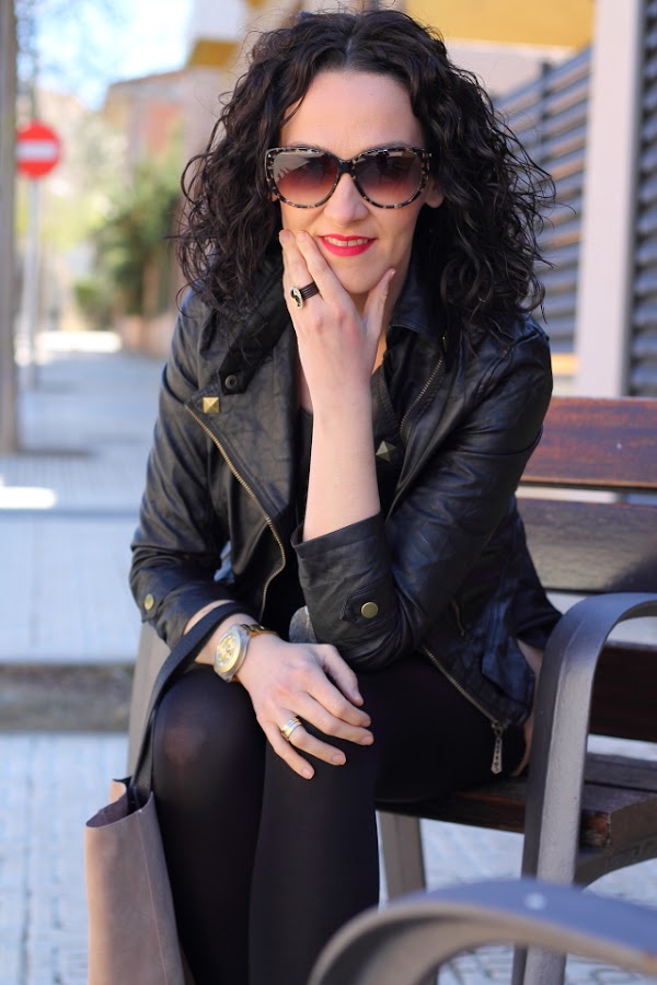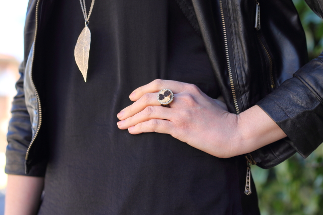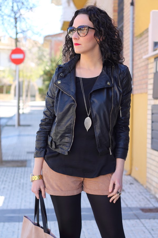 Esta semana llegó a casa esta chaqueta estilo biker de Rosewholesale y no he podido esperar a estrenarla. Hacía tiempo que me apetecía una biker negra pero tenía claro que la quería diferente, por eso el estilo de esta más cortita, tipo torera me encanta. La he combinado con un top negro y mis queridos pantalones de piel marrones. Para los complementos un sencillo colgante en forma de hoja, anillo con animal print y mi nuevo bolso que con la combinación de colores que tiene queda perfecto en el estilismo de hoy.