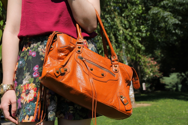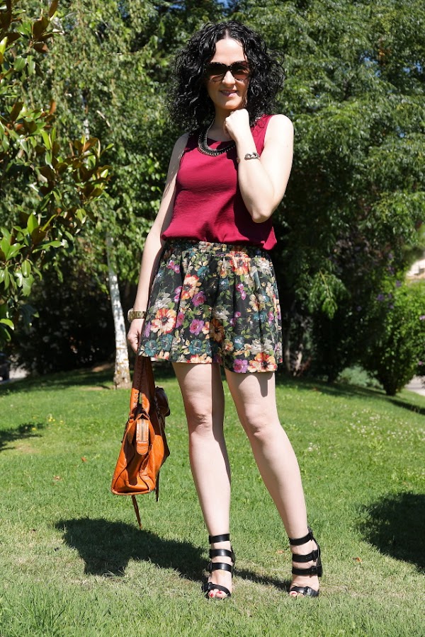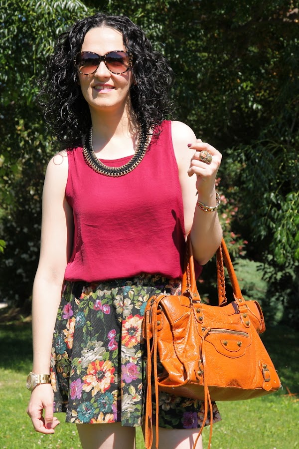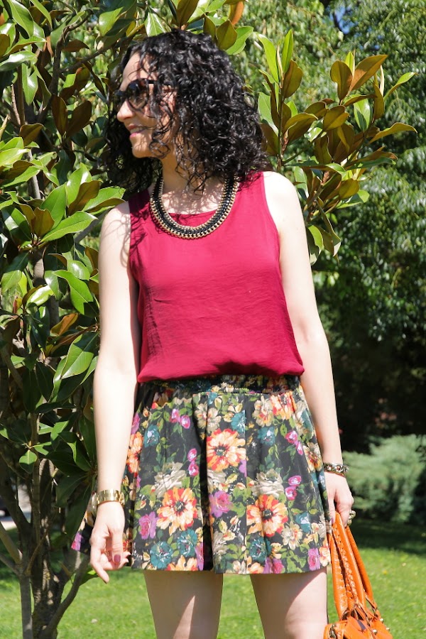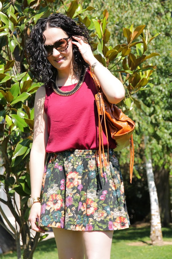Cada vez que me he puesto esta falda de flores la he combinado con blusas y tops de diferentes colores pero el burdeos nunca había sido uno de ellos. Sin embargo, la semana pasada me compré este top burdeos y cuando me lo puse con la falda para ultimar algunas cosas de mi próximo viaje me encantó.