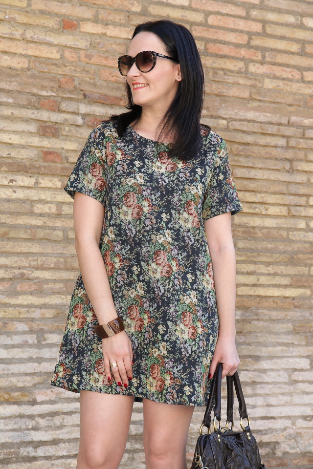 Me encantan los vestidos y las faldas, como veis gran parte de mis looks son con ellos. Este vestido de flores con aire sesentero es uno de los últimos que han entrado en mi armario y no puede gustarme más. Fue una de esas prendas que nada más verlas te enamora de tal manera que te la compras sin pensártelo dos veces. Tiene un tejido con mucho cuerpo que queda genial y el estampado de flores es precioso. Pero si el vestido me gusta, los complementos no se quedan atrás con la pulsera y el anillo de Calvin Klein en tonos marrones.