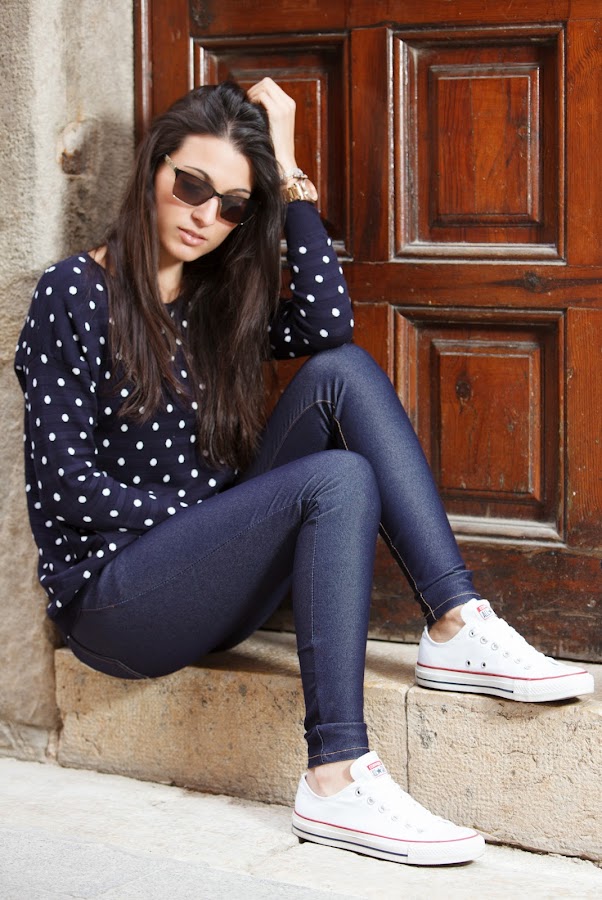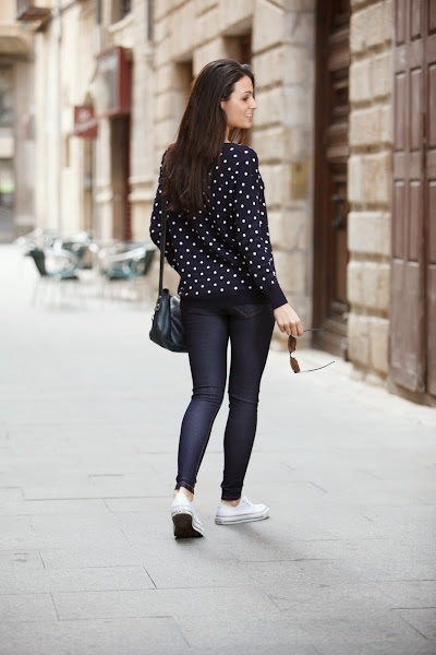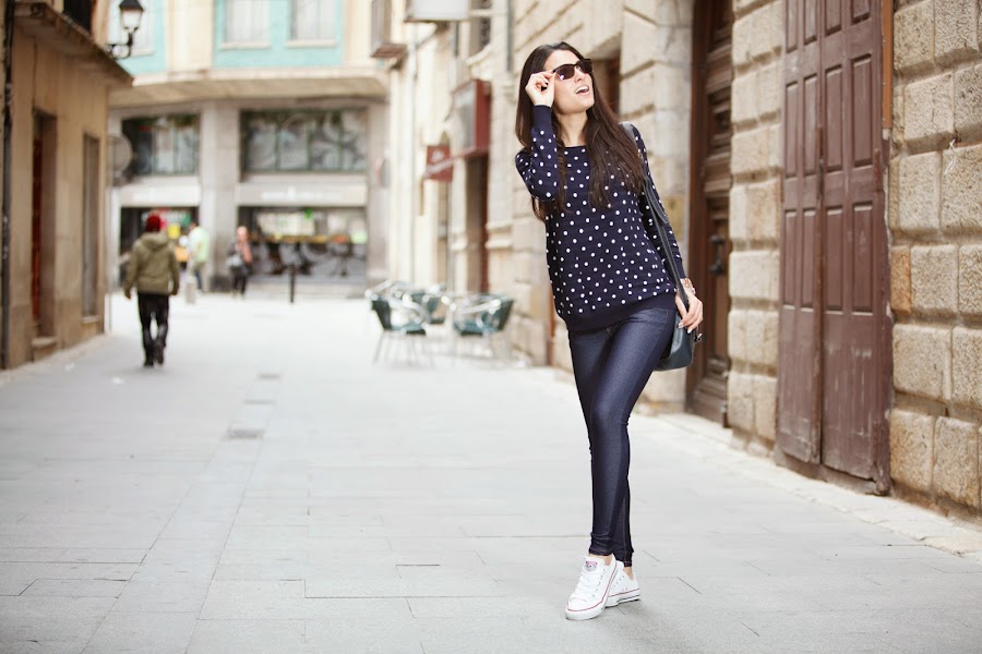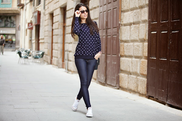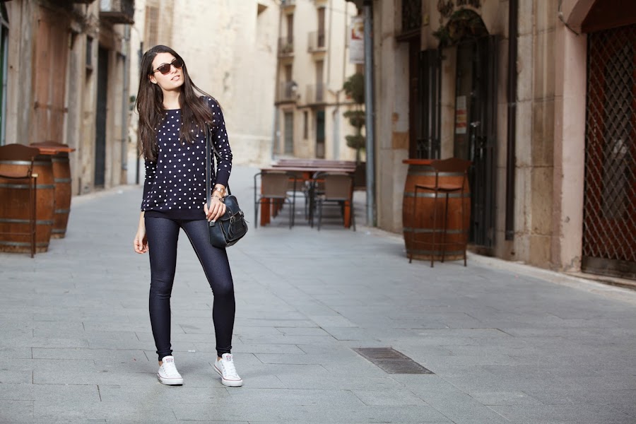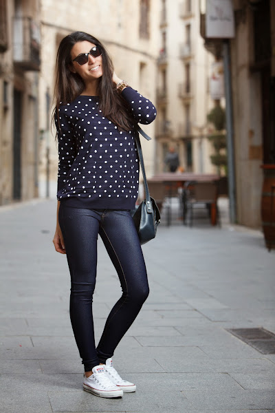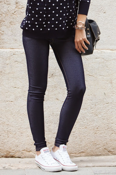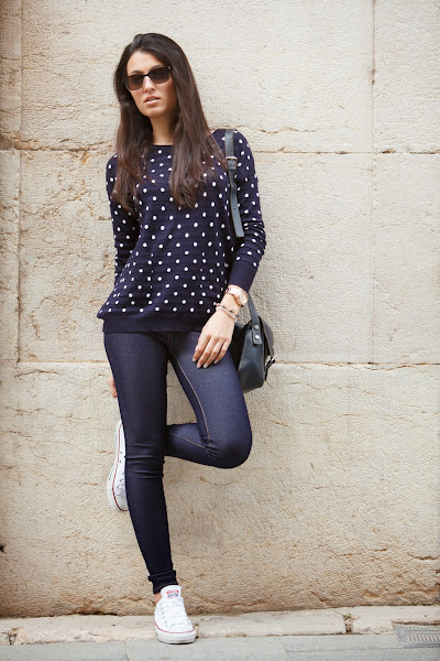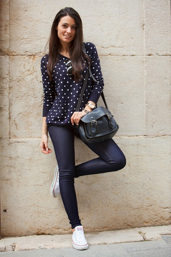 El look sin más para diario y muy yo. Mi jersey de topitos y mis jeggins de MINIPREUS junto mis CONVERSE, mi bolso de piel azul marino, mi reloj MAREA y mis POUSA DURANY. =)