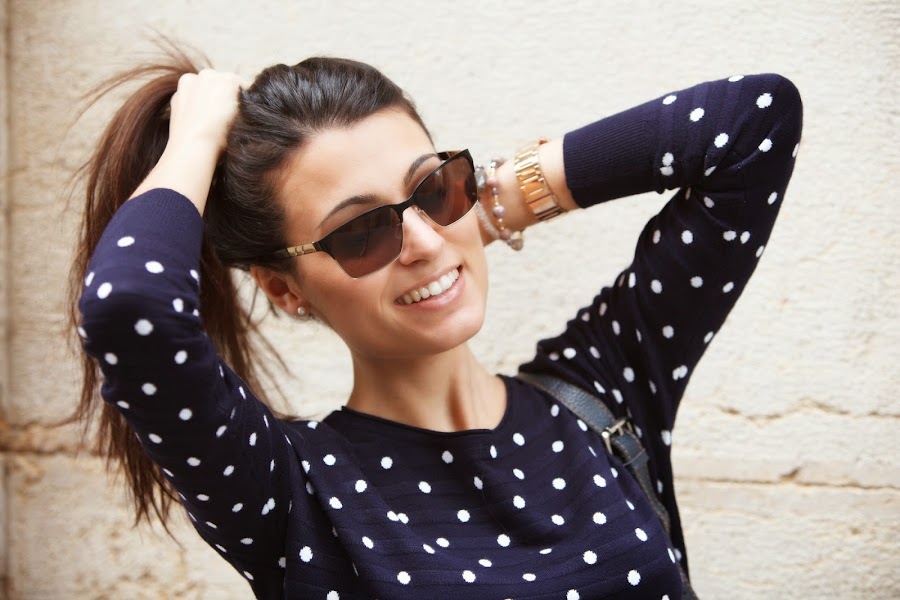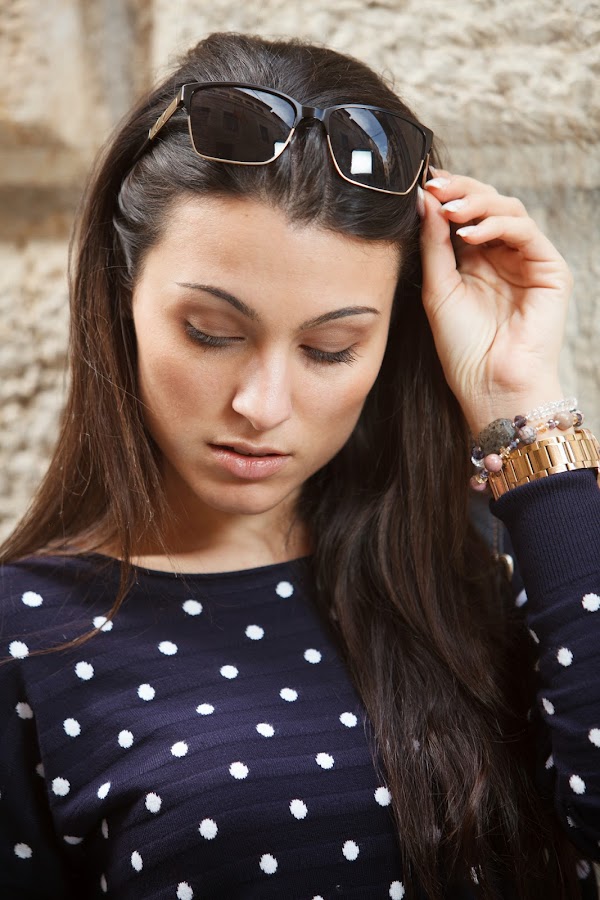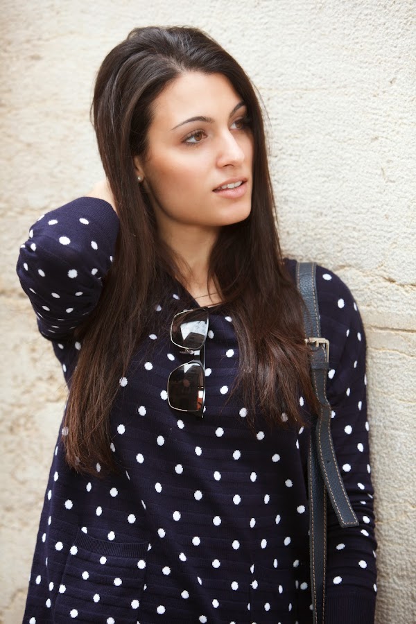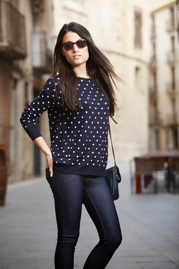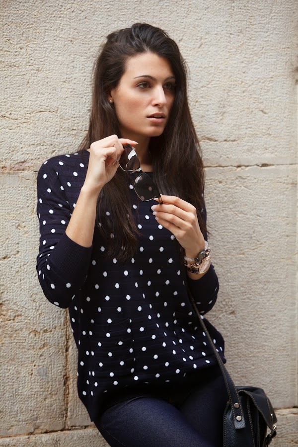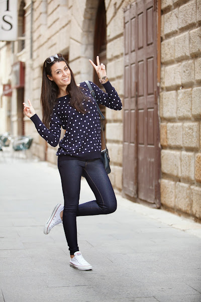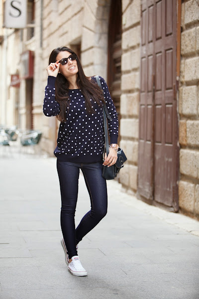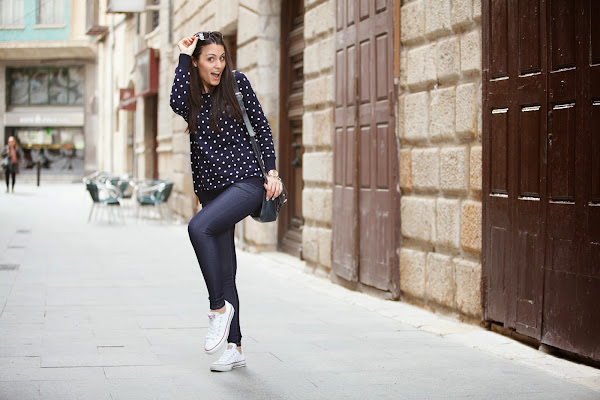 El look sin más para diario y muy yo. Mi jersey de topitos y mis jeggins de MINIPREUS junto mis CONVERSE, mi bolso de piel azul marino, mi reloj MAREA y mis POUSA DURANY. =)