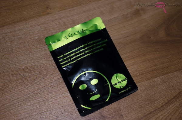 Mascarilla Detox de carbón negro de JúliaEs una mascarilla con carbón negro activo purificante, su formato es de un uso tipo tisú y está bastante impregnada en producto, de hecho hay que tener cuidado porque escurre el producto. Nos indica que sirve para eliminar exceso de grasa e impurezas, además de cerrar poros.