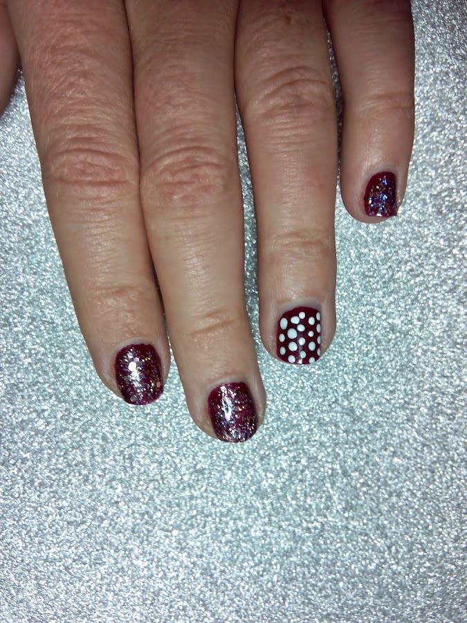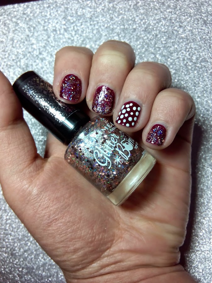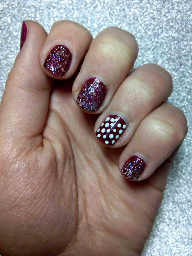 Hoy os muestro una manicura muy sencilla: un nail accent de polka dots (puntitos) y glitter disco diva de Rimmel London (os hablé de él en la entrada "Flores delicadas con glitter") que le hice a mi hermana en vísperas de Reyes :)