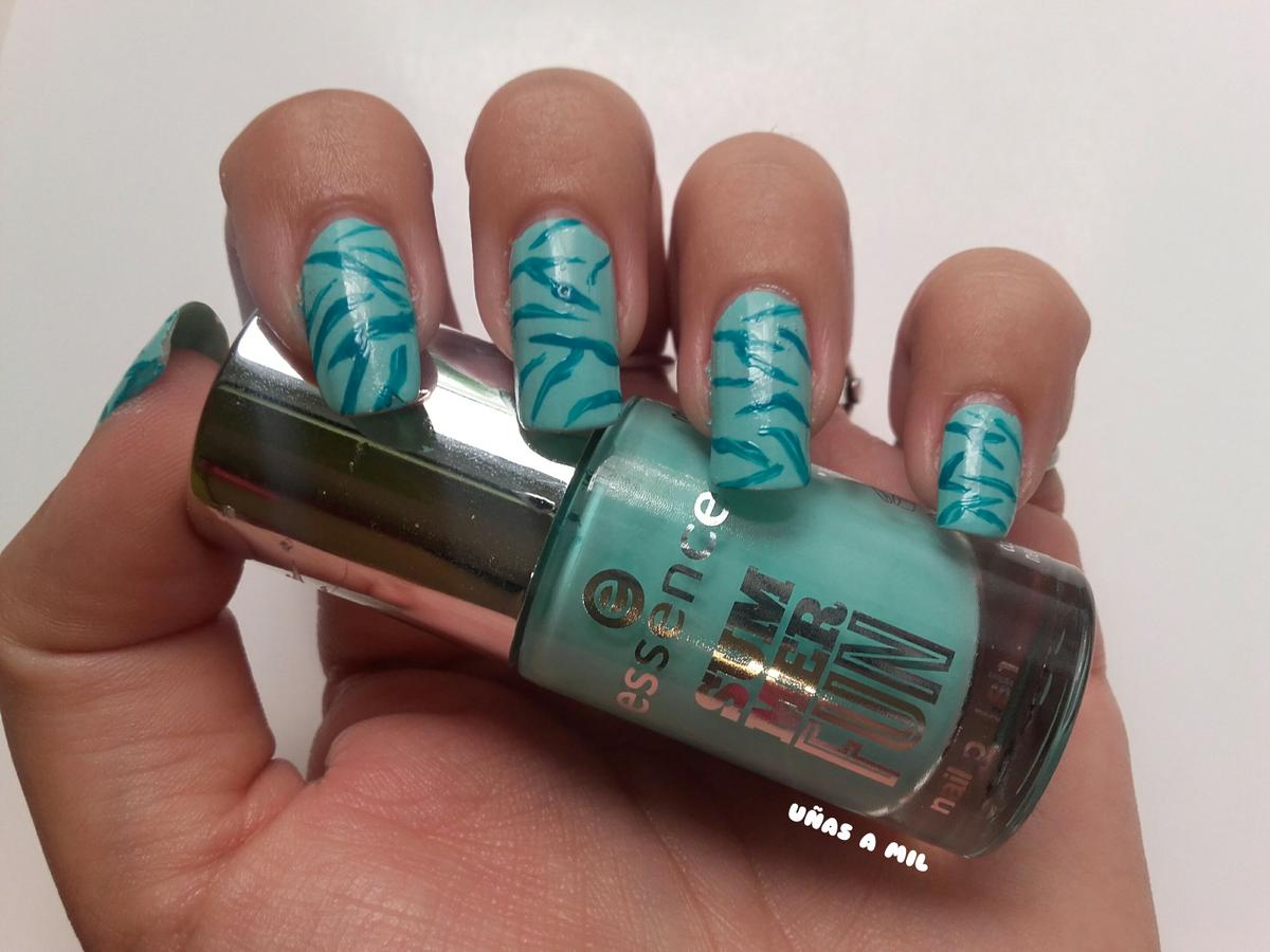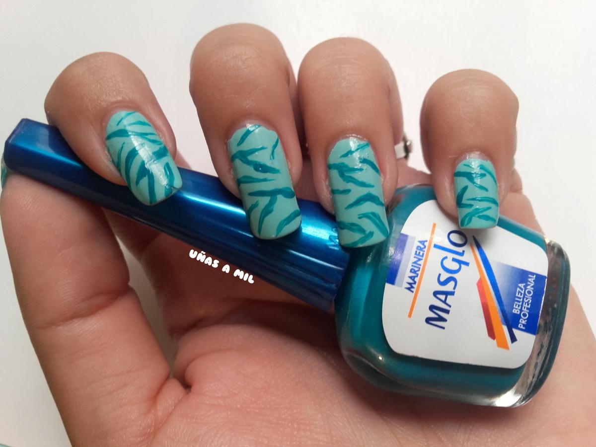 Para hacer las rayas de cebra no hace falta tener mucha precisión, se trata de dar pinceladas irregulares, para ello he utilizado el esmalte especial para nail art con pincel fino de la marca Masglo, un tono azul mas oscuro que el anterior que se llama ”Marinera”.
