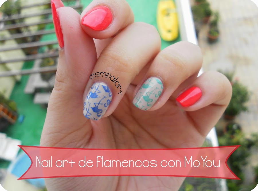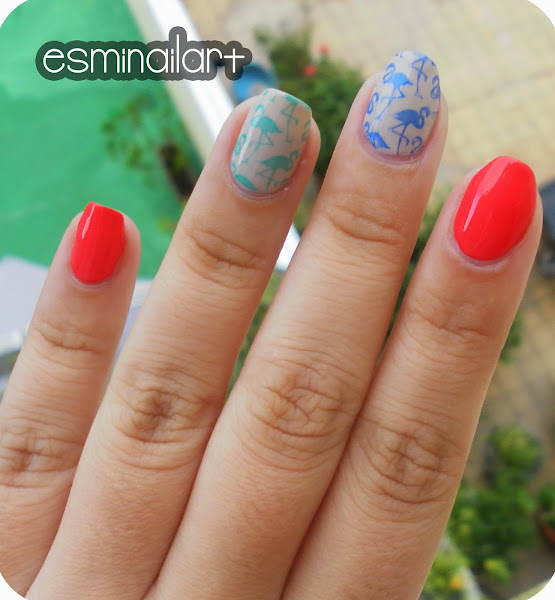 Ahora vamos con la manicura de hoy, para hacerla utilicé el esmalte 08 de los POP Your Style de Deborah Milano y el 79 Sand Tropez de Essie, y para estampar el Saved by the blue de Wet N Wild y el 02 de los POP Your Style de Deborah Milano. El diseño que escogí es de unos flamencos preciosos, muy muy divertidos... ¡¡Esta placa me encanta!!