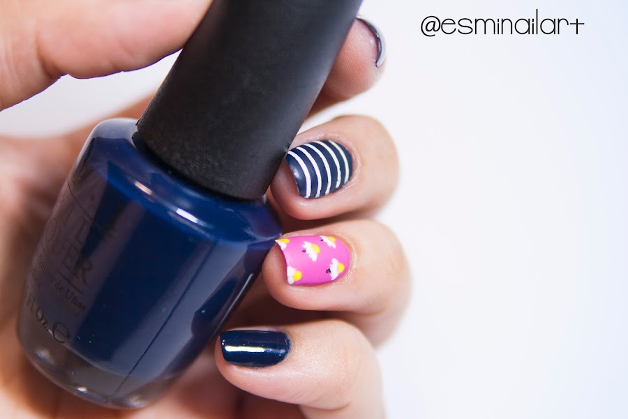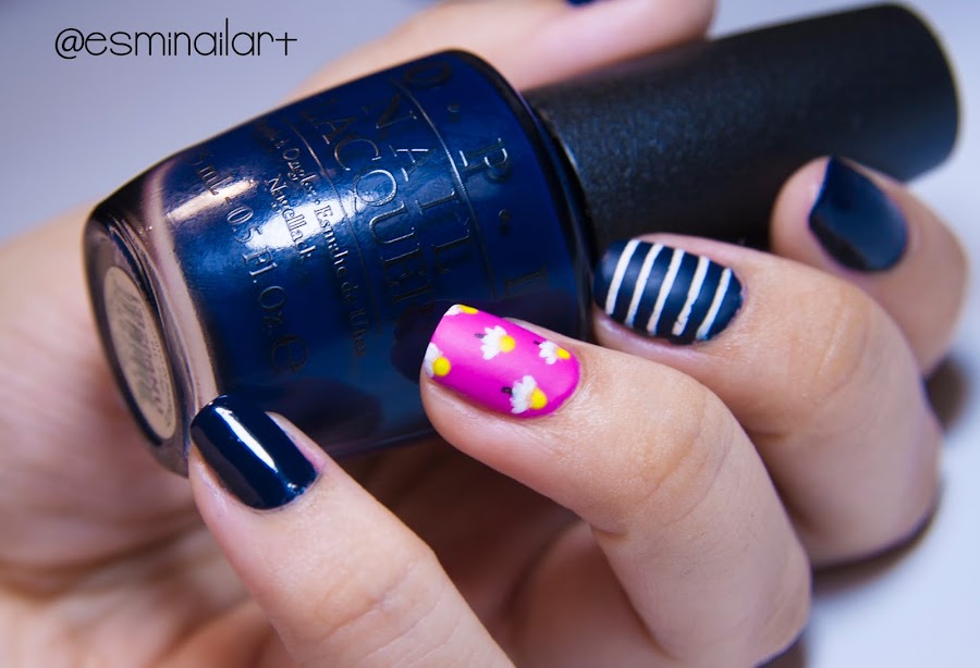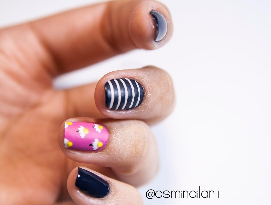 Para realizar esta manicura utilicé los esmaltes Incognito in Sausalito de OPI, Beige de Perfect Beauty by Juliette Crowe y Rosa intenso también de esta marca. Las margaritas las realicé con pintura acrílica y las líneas con striping tape o cinta para nail art (¡retirarla inmediatamente después de aplicar el esmalte por encima!).