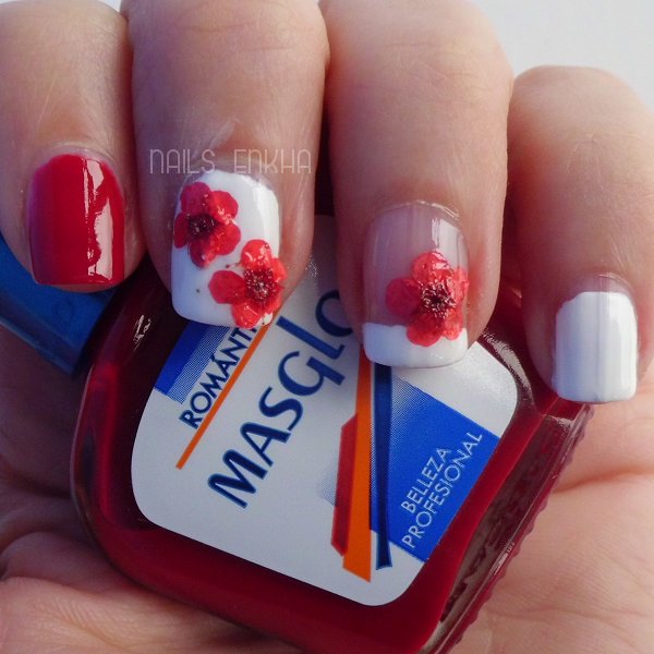 Las flores secas en un nail art me han parecido muy fáciles de utilizar, yo lo que he echo es preparar el nail art que quería en las uñas en las que iban a ir las flores, que mi opción fue pintar una uña entera de blanco y en la otra una francesa y cuando el esmalte aún no estaba seco pero estaba lo suficiente húmedo para la flor se quedara pegada en el. Para aplicar como son muy delicadas las aplique con unas pinzas y luego con la yema del dedo y con mucho cuidado le di toques para que quedaran bien pegadas con el esmalte.