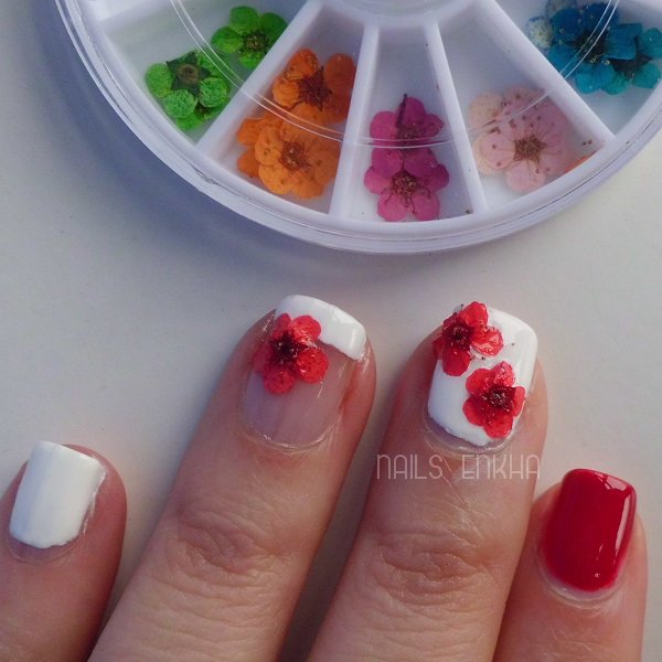 Habéis utilizado alguna vez flores secas para vuestras manicuras? Sois de tener este tipo de ruedas con adornos de nail art? Como os gusta más el diseño, con la francesa y la flor o es mejor la opción de la uña en blanco con las dos flores?