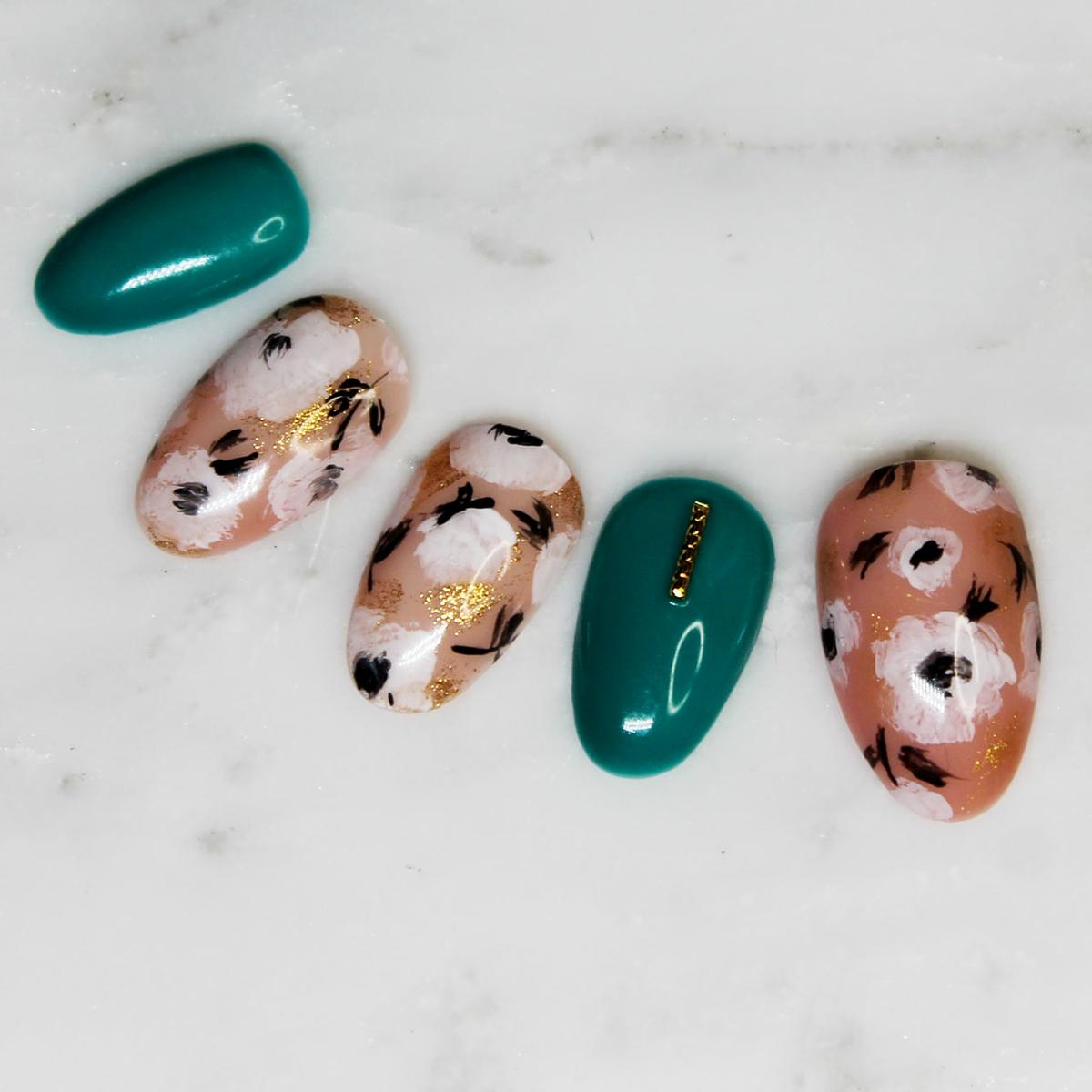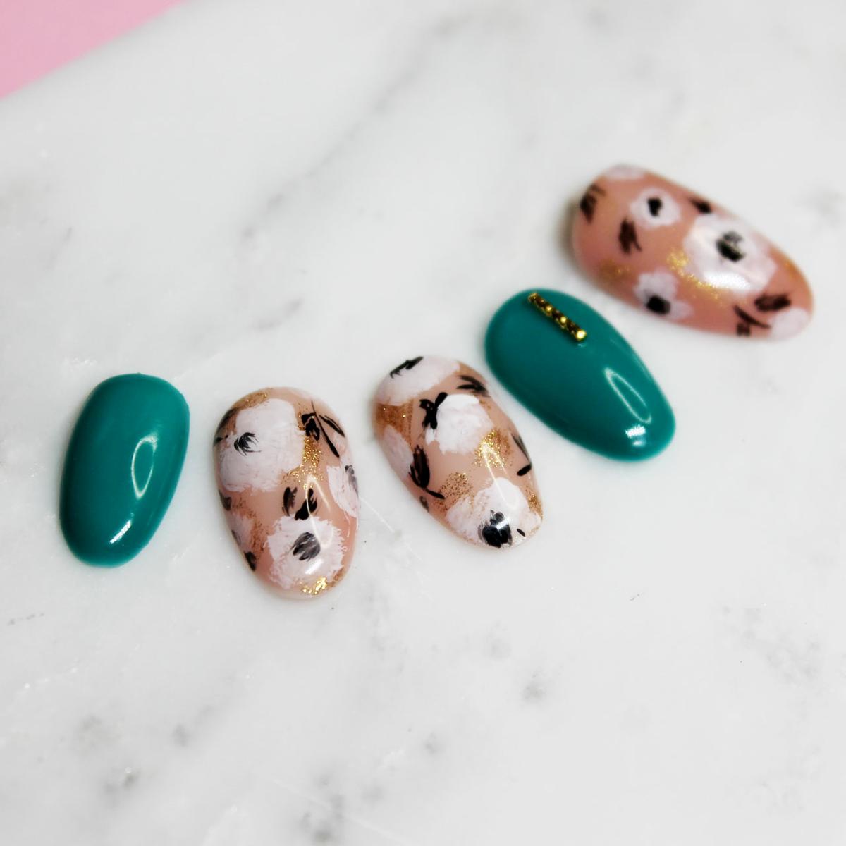 Para el resto de la manicura utilizaré un bonito esmalte verde que creo encaja a la perfección. Se llama Aruba y es de la colección de Nailistas. Pintaré dos uñas con este verde y en las otras dos repetiremos el estampado de flores.