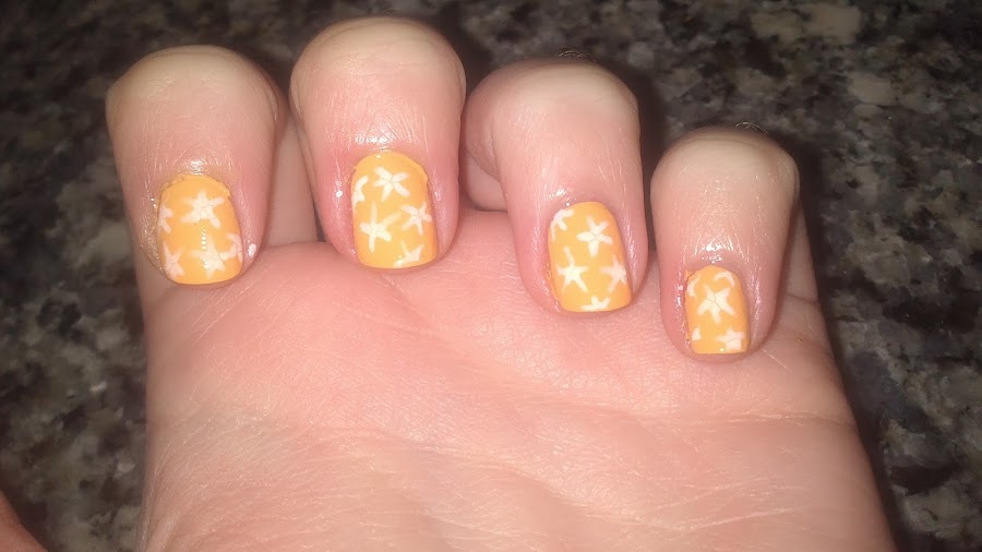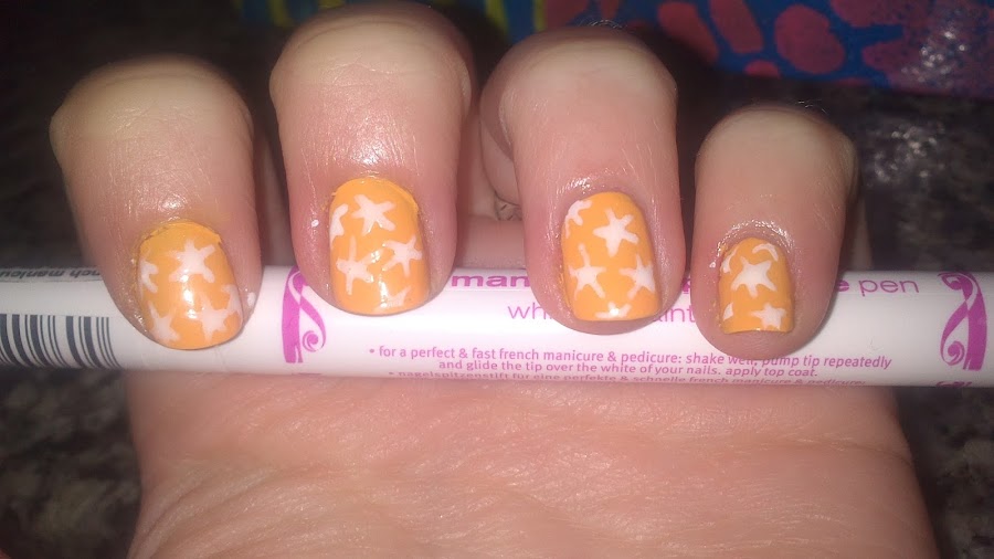 Cuando comprobemos que está bien sequita, realizaremos estrellitas del color que más os guste, en mi caso blanca. Para realizarlas, yo he utilizado el "Manicure & Pedicure pen" de Essence, pero también lo podeis hacer con un dotter de punta fina, un palillo de dientes, un palito de naranjo...cualquier material que tengáis con una punta fina.