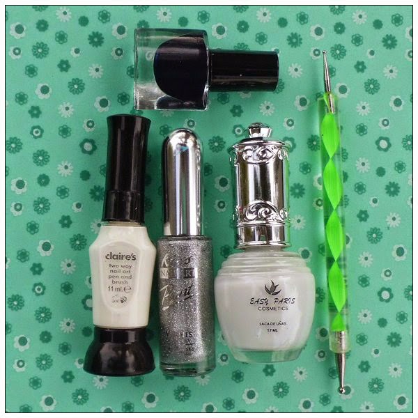*Pintamos dos unas en azul y dos en blanco, cuando este seco con el color contrario en dos de ellas hacemos una francesa y además le pondremos otra linea en color plata. En las uñas que no llevan francesa haremos dos puntos de diferentes tamaños.