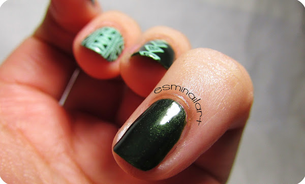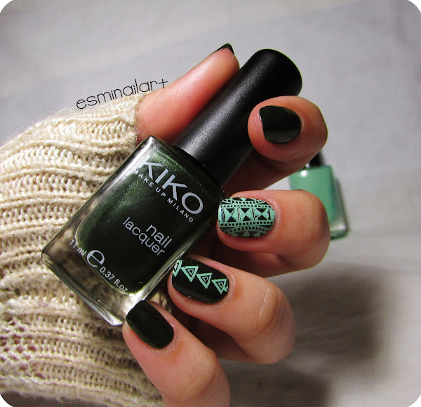 El esmalte base que utilicé para esta manicura fue el 392 de Kiko, un verde oscuro con un shimmer casi imperceptible que le da un toque muy especial. Para estampar utilicé la placa BM-605 de la colección Create Your Own 2014 de Bundle Monster y el esmalte Spring Green de Mundo de Uñas. Para acabar la manicura, como siempre, una capa de top coat Poshé.