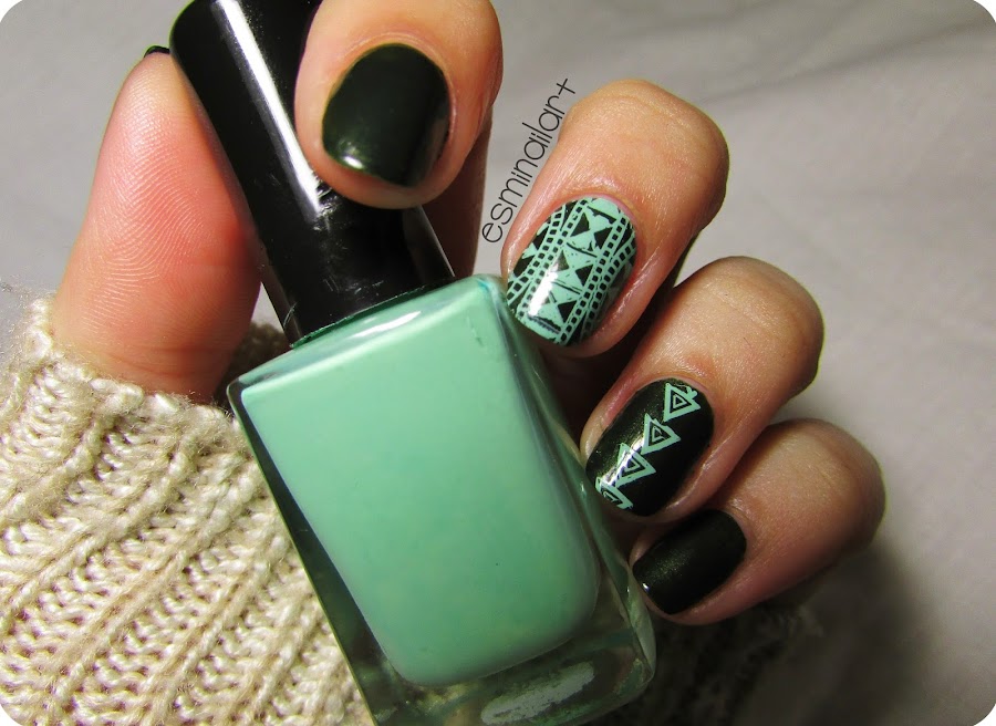 En la anterior entrada os enseñaba uno de mis esmaltes de Mundo de uñas, y hoy, os muestro el que es mi favorito de los 3 que tengo: el #56 Spring green. Un verde menta precioso y que estampa de maravilla sobre tonos oscuros. Además, aproveché para utilizar mis placas de Bundle Monster, que tengo bastante abandonadas últimamente.