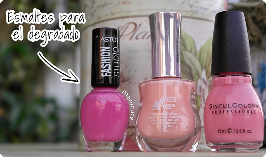 Una vez seco, pintamos tres franjas en la esponja de maquillaje, que irán desde el melocotón (Yes Love), pasando por el rosa anaranjado (Sinful Colors) y terminando por el rosa fuscia (Astor). Dejamos que pasen unos segundos para que la esponja absorba el exceso de pintaúñas.