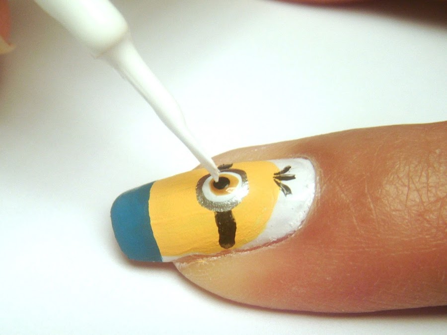 Procedimiento paso a paso:1) Vamos a pintar toda la uña dónde va a ir el Minion de color blanco, dos capas delgadas son suficientes y dejamos secar completamente.