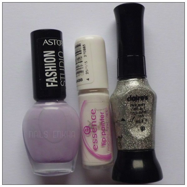 *Aplicamos siempre nuestra capa base y cuando este seca a continuación pintamos todas las uñas con el color lila y esperamos a que este bien seco. Con el color plata hacemos una raya en un lado de la uña volvemos a esperar a que este color este sexo y con el color blanco hacemos una raya a cada lado del color plata, esperáis a que este bien seco porque sino corremos el riesgo de que se muevan los colores y nos estropee la manicura el top coat.