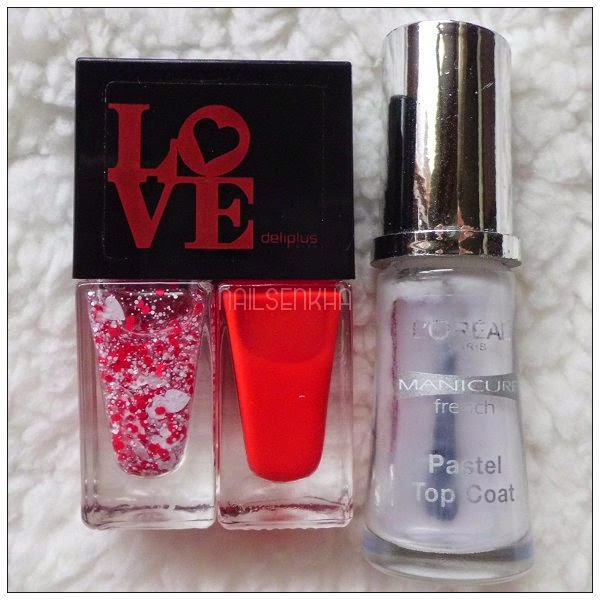 *Cuando este seco en las uñas que llevan el color paste hacemos una francesa en rojo y en la uña de color rojo aplicamos el topper de corazones del pack de la colección límitada de Deliplús. Ya la cantidad de glitter o de corazones depende del gusto de cada una.