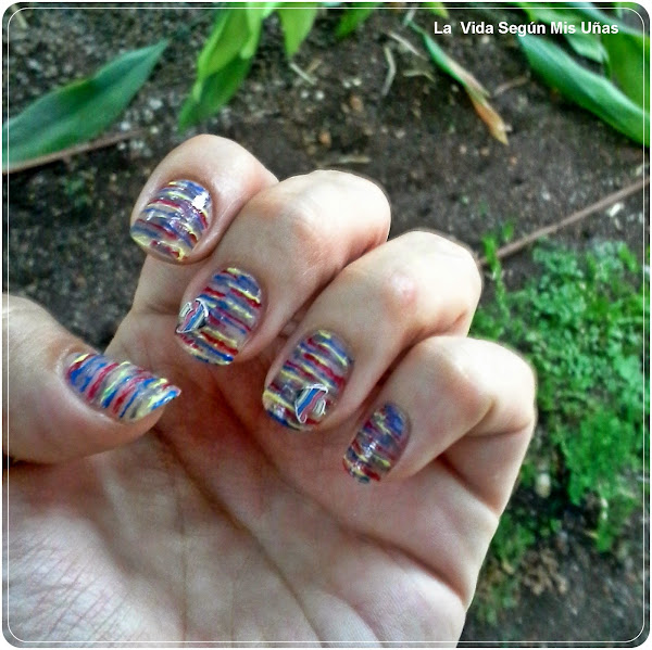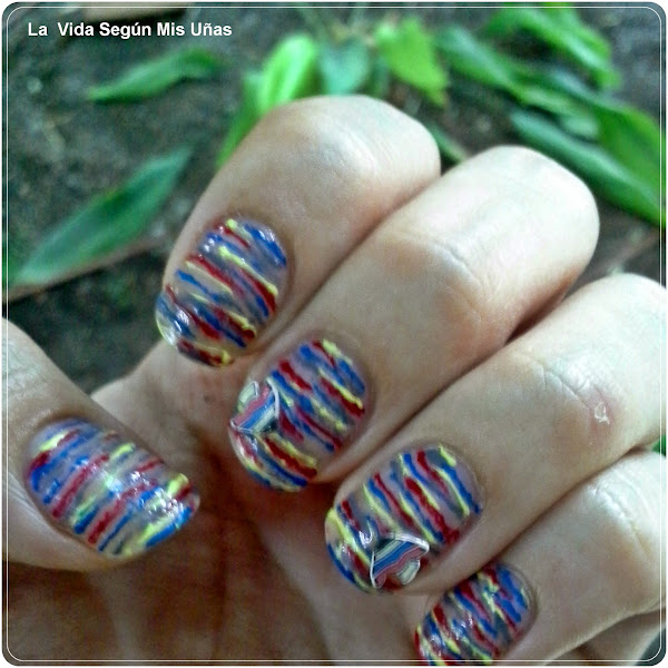 Al ver los colores de los peces me vino a la cabeza que estaría bien hacer una base con ellos con lineas irregulares y pone un par de peces encima, no sabía como iba a salir, pero me ha gustado mucho el resultado. Los peces los coloqué enfrentados en dos uñas. Y los colores utilizados fueron amarillo, rojo, gris y azul.