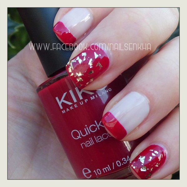 *Aplicamos nuestra capa base y esperamos a que este seca a continuación en tres dedos pintaremos el color de Kiko y en los otros dos el de Lóreal, cuando este bien seco todo en el de L"oreal hacemos una francesa con el color de Kiko y en el de Kiko aplicaremos el pan de oro de Deliplús.