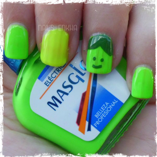 La tercera manicura que hice al final se fue a la papelera del ordenador porque no me gusto como quedo, así que ya por último digo voy a hacer una carita. No solo los ojos y la boca, esta vez le voy a poner pelo. La verdad es que no se a que me recuerda la carita tan verde.