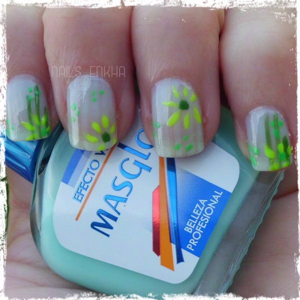 El primer nail art son unas flores, utilice de base el esmalte Masglo Efecto velo, en algunas uñas hice unas rallas con el esmalte de pincel fino de Masglo color Pino, la flores fueron con el Masglo Traviesa que también es de pincel finito y los puntos los realice con el Masglo Intensa que también es de pincel fino. Este verde en el nail art que realice la verdad que se me aprecia poquito. Así que al final decidí hacer más manicuras.