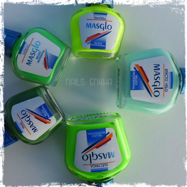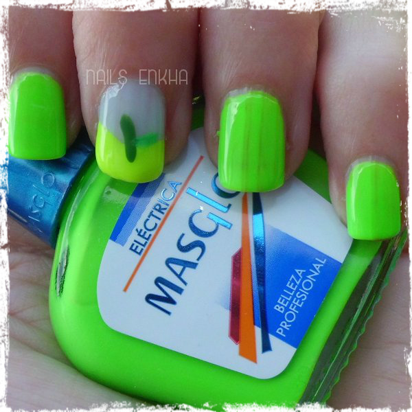 De base utilice los colores Masglo Eléctrica y con el esmalte de pincel fino Masglo Traviesa me pinte una uña, en la uña que lleva el nail art utilice el Masglo Pino de pincel finito.