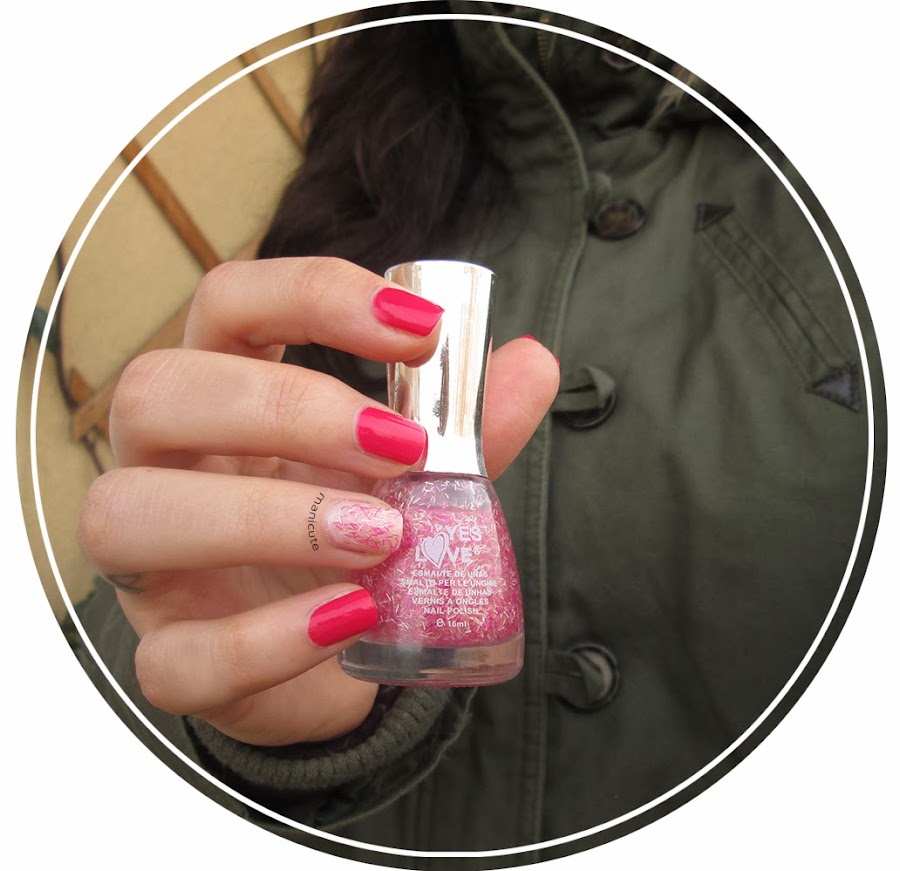 Bueno, una de las colecciones más míticas que ha sacado Sally Hansen es la llamada Fuzzy coat; se trata de los típicos esmaltes con efecto "fideo". Aprovechando que tengo un top coat de Yes Love llamado Feathers que también es de fideos, marqué una accent nail con él. La pinté de rosa palo y di encima dos capas de Yes Love. Ya sabéis que esta marca la podéis encontrar en chinos y no suelen vender los esmaltes por precios superiores a un euro.