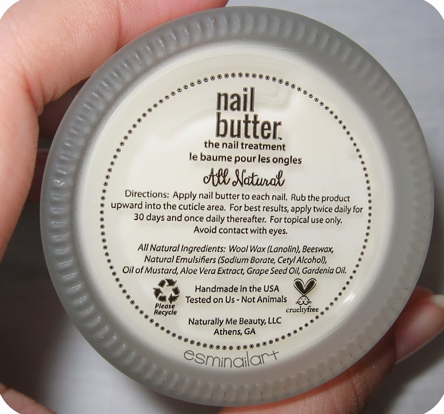 Nail butter es una crema para cutículas "para fortalecerlas y rejuvenecerlas" que realiza la empresa Nail Butter, de Christine Cole, de manera manual. No indica la cantidad, pero es de aproximadamente 25-30ml y cunde muchísimo, llevo usándola desde hace 3 meses y todavía queda mucho más de la mitad. Sus ingredientes son 100% naturales como podéis ver en la foto de abajo, y además no está testado en animales. Su precio es de 24$ más el envío, que en caso de ser a mi zona (Galicia) es de 9$.