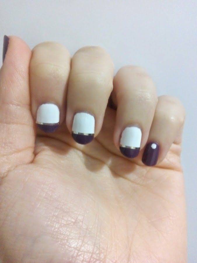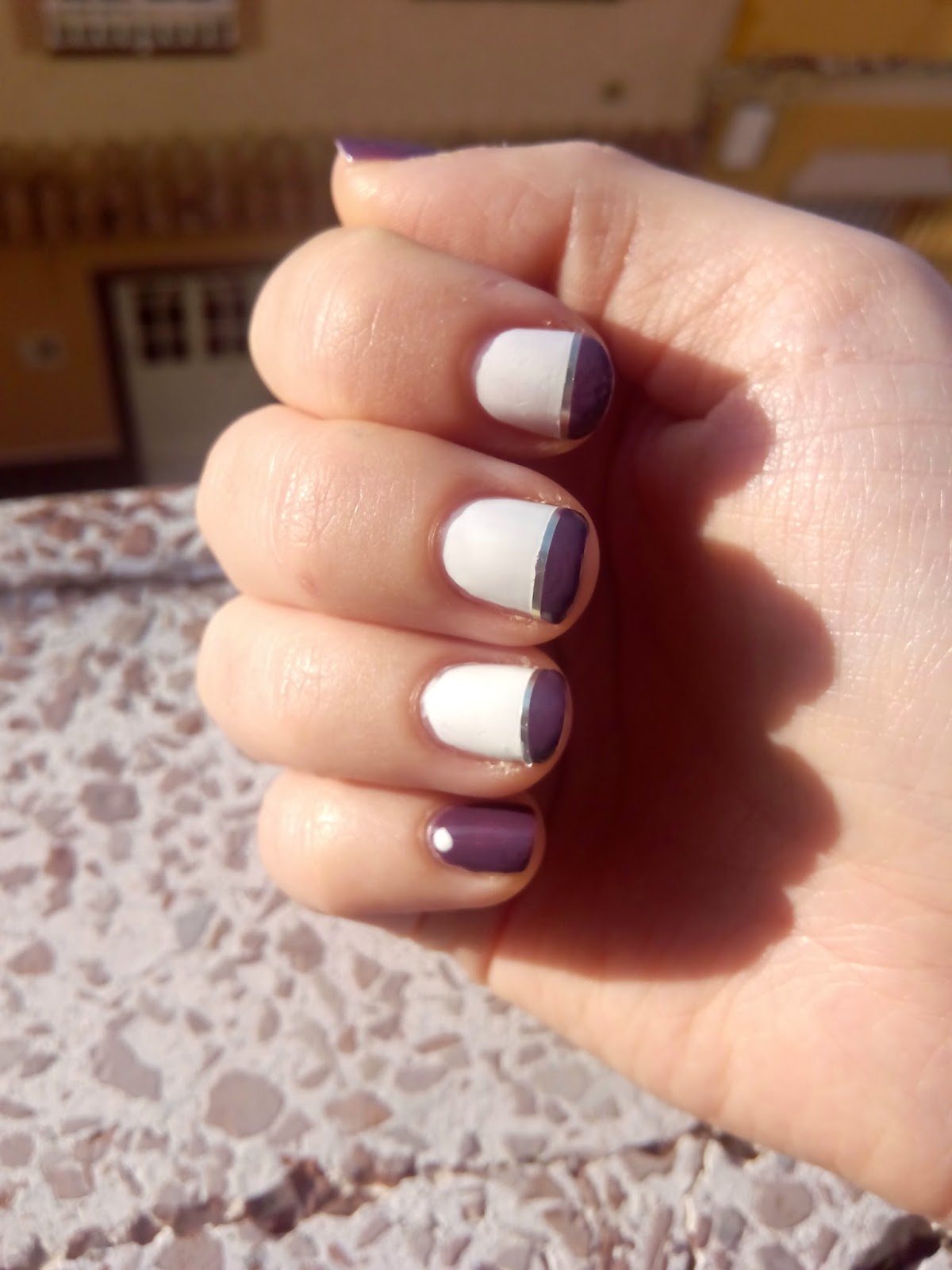 Las otras tres uñitas las he esmaltado de blanco. Cuando están secas he pintado el borde libre de la uña en lila y posteriormente he pegado el nail tape.