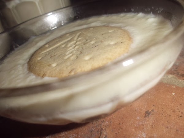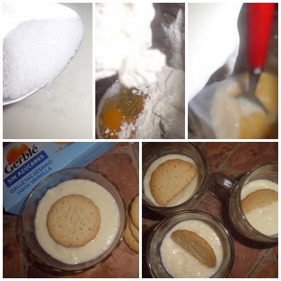 Una vez que están hechas, reparte las natillas en 4 boles y pon encima o dentro una galleta. Siempre la pongo cuando hago flan o natillas.
