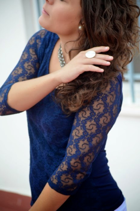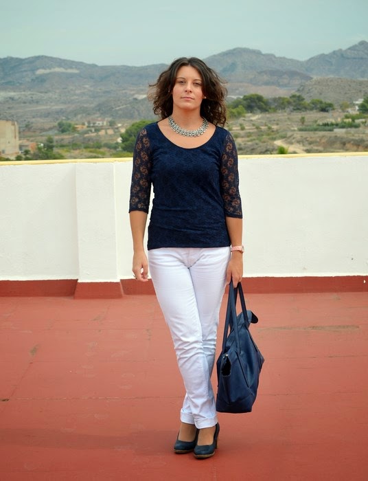 Hoy os muestro en este post mi lado más natural haciendo una sesión de fotos. Cuando hacemos los shootings, a parte de que las fotos queden "decentes", lo importante es disfrutarlo y pasarlo bien. Desde que he vuelto de Peñiscola entre el trabajo, la mudanza, organizar papeles, cambiar el armario y un montón de cosas más no he tenido tiempo de hacerme fotos. El outfit de hoy se corresponde con el look de ayer domingo para volver a casa antes de coger el tren desde Alicante. Fue una sesión express en 5 minutos, y en las fotos me muestro tal y como soy, seria a veces y dando vueltas como una niña en otras. El look que elegí fueron unos pantalones blancos con una camiseta de manga francesa en azul marino con detalle de encaje, un look muy básico y buscando la comodidad ante todo (me esperaban casi 3 horas de tren sentada).