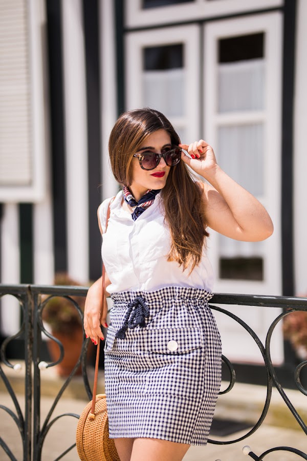 Como soy muy clásica me gusta combinar este estampado con prendas blancas y azul marinas, lo que me ayuda a crear un look marinero perfecto. Opté por una blusita blanca, un pañuelo con motivos náuticos, un capazo redondo y unas sandalias Jack Rogers.