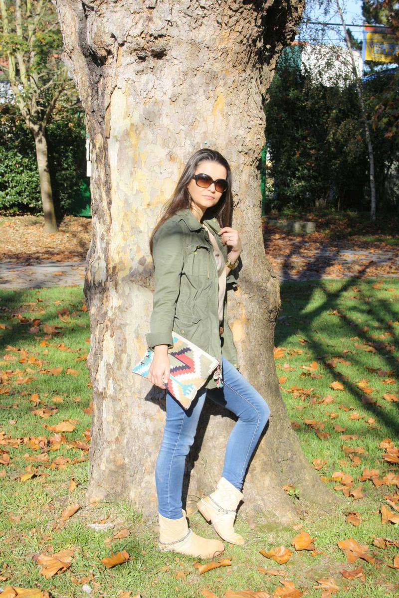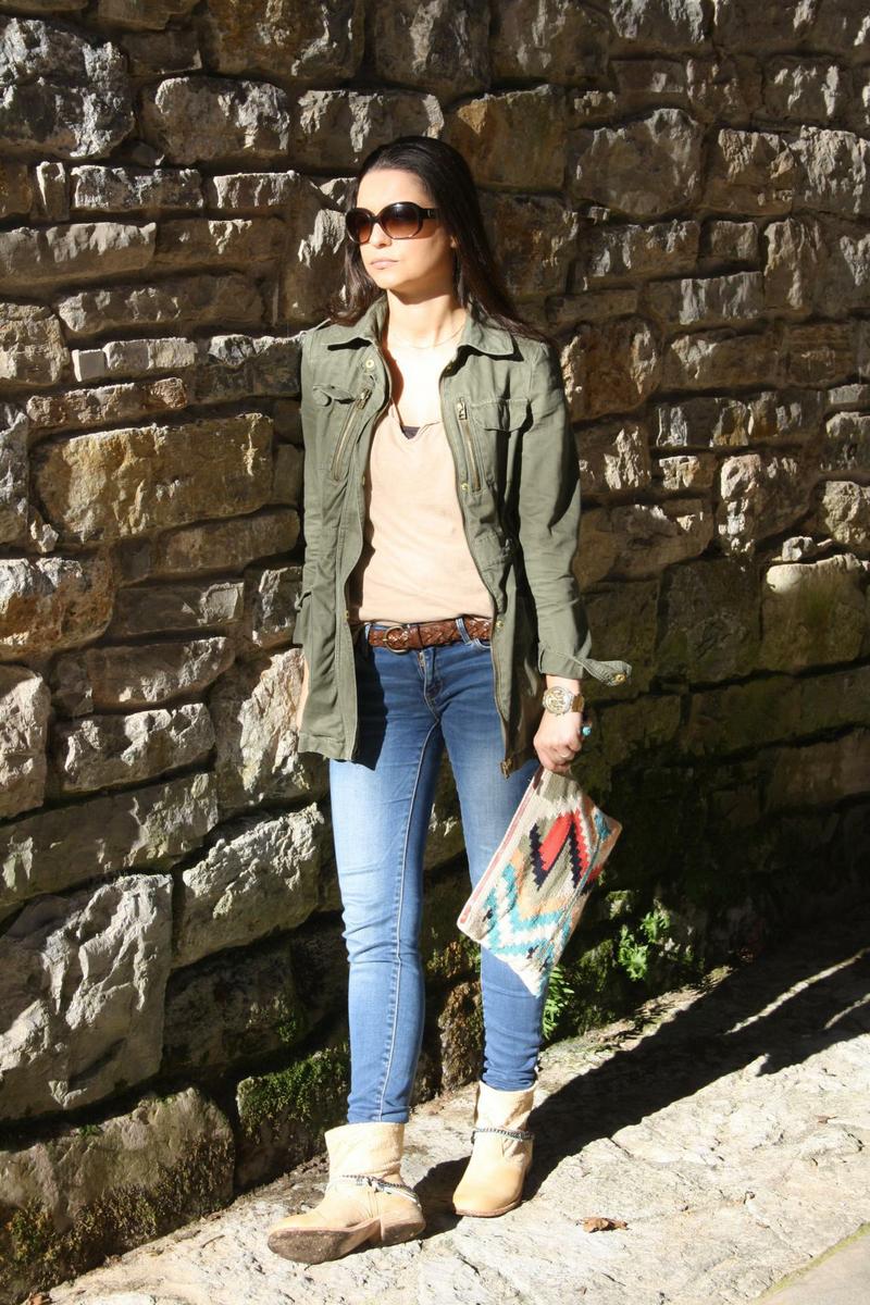Lo hemos combinado con una sobrecamisa verde militar, unos jeans y las botas camperas.
