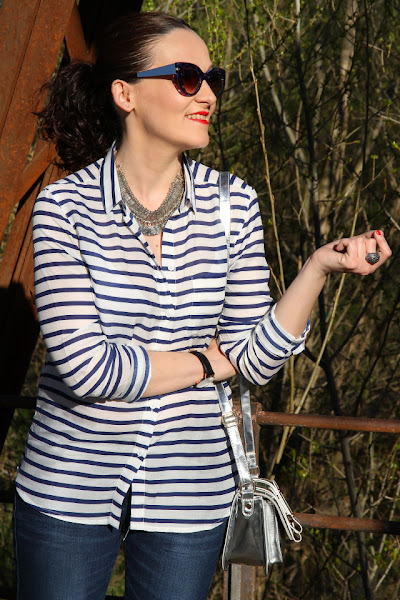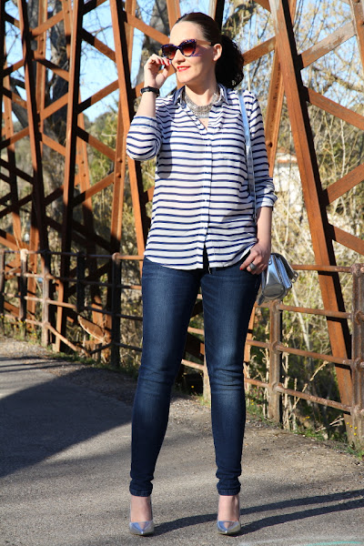 Siempre he pensado que los complementos son una de las partes más importantes de un look. Una elección mal hecha nos lleva muchas veces a encontrarnos con oufits que nos llevan a pensar "si se hubiera puesto otro tipo de zapatos..., o con este bolso habría estado mucho más mona...". Muchas veces me comentáis que siempre llevo los complementos ideales para el look que llevo, la verdad es que me declaro fan absoluta de ellos y siempre paro mucho cuidado cuando los elijo para mis estilismos. Hace unos días os enseñé aquí este mismo look con camisa de rayas y jeans pitillo pero con unos complementos más casuals como son las New Balance y el bolso tamaño XL, hoy en cambio le he dado un toque más chic añadiéndole detalles en plata con el collar étnico, los stilettos y el bolso.