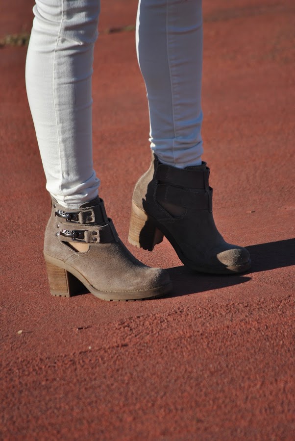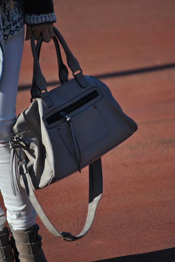 Para complementar, bolso en gris tapia y botines del mismo color.