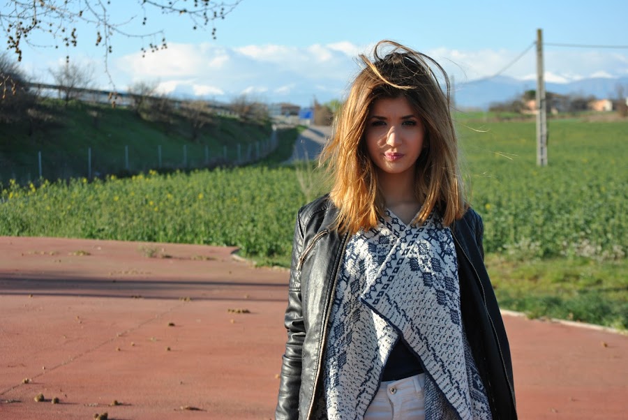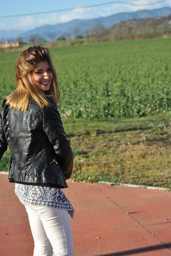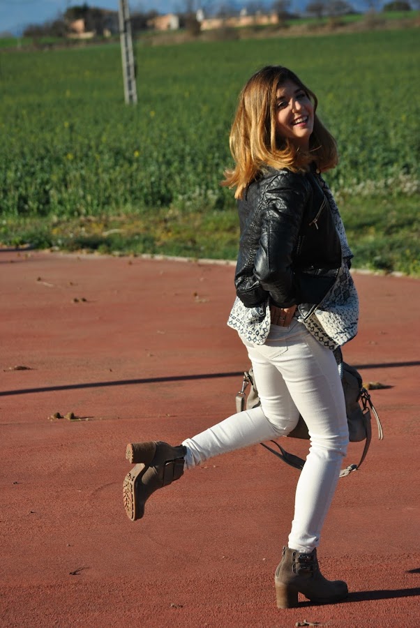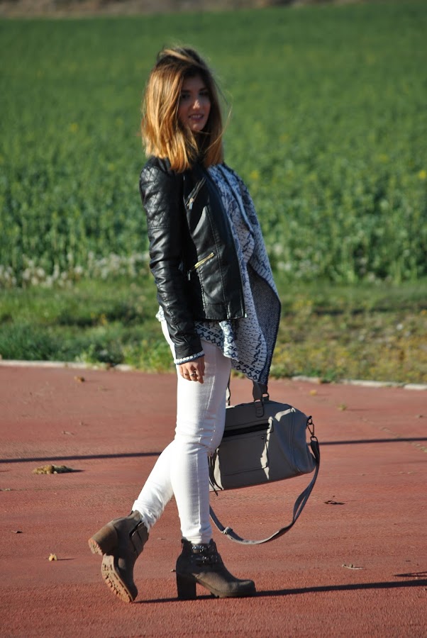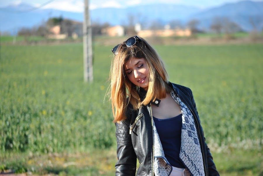 Ell día que hicimos las fotos hacía un poco de frío aún, así que a demás llevaba una chupa de piel negra, que siempre queda bien con todo y rompe un poco con los colores que predominan en el look.