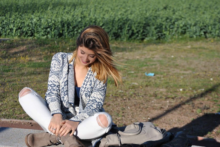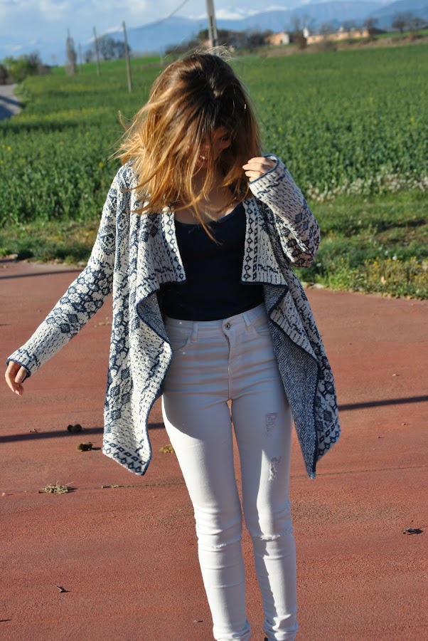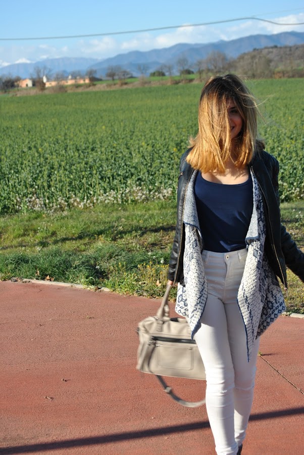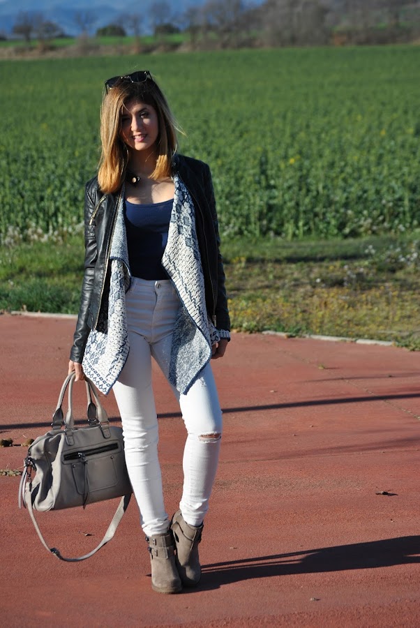 Today I am wearing a blue and white cardigan from System Action, with a navy blue top and white jeans. For accessories, greyish bag with booties in the same color.