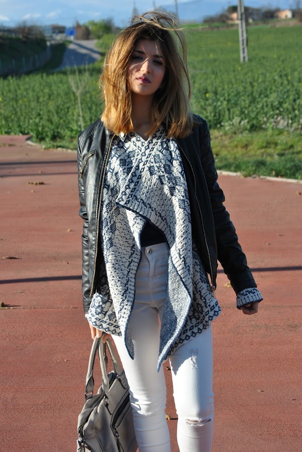 The day we took the photos it was a little bit cold so I added a black biker that always looks good with everything and also breaks up a little bit with the blue-white mix.