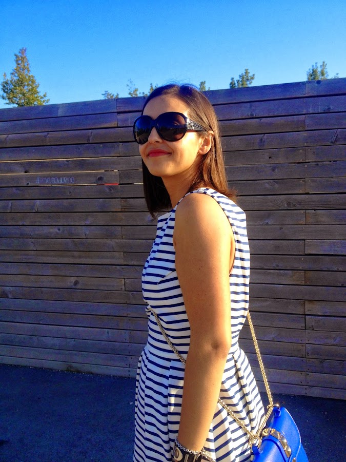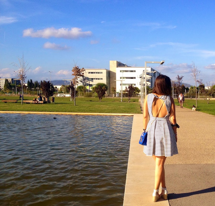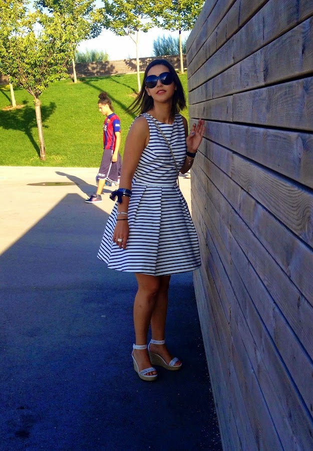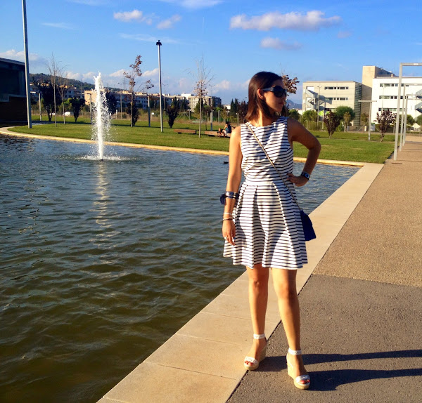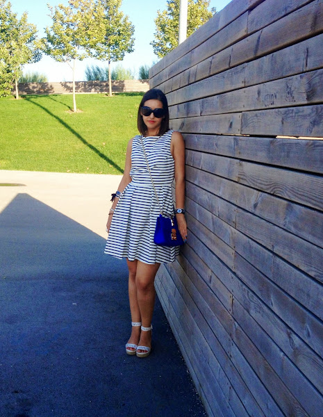 Feliz viernes chicas! Hoy os dejo con un vestido que tenía desde Junio en el armario, pero que todavía no había estrenado. Se trata de un vestido con rayas azules y blancas, con la espalda al descubierto. Me lo puse con mis sandalias blancas y mi bolso azul de Sweet Coquette.