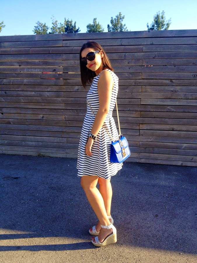 Happy Friday, girls! Today I show you a dress that I bought in June, but I haven"t worn yet. This dress is white and blue stripes, but it has open back. I wore it with my white sandals and my blue bag of Sweet Coquette.
